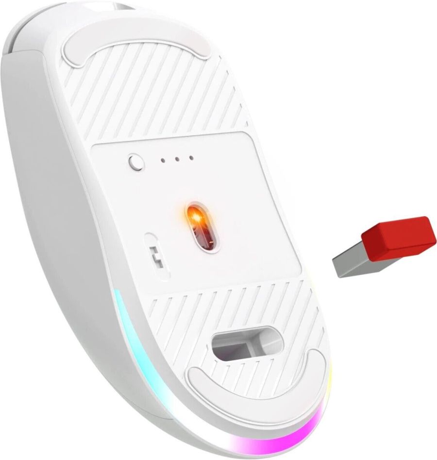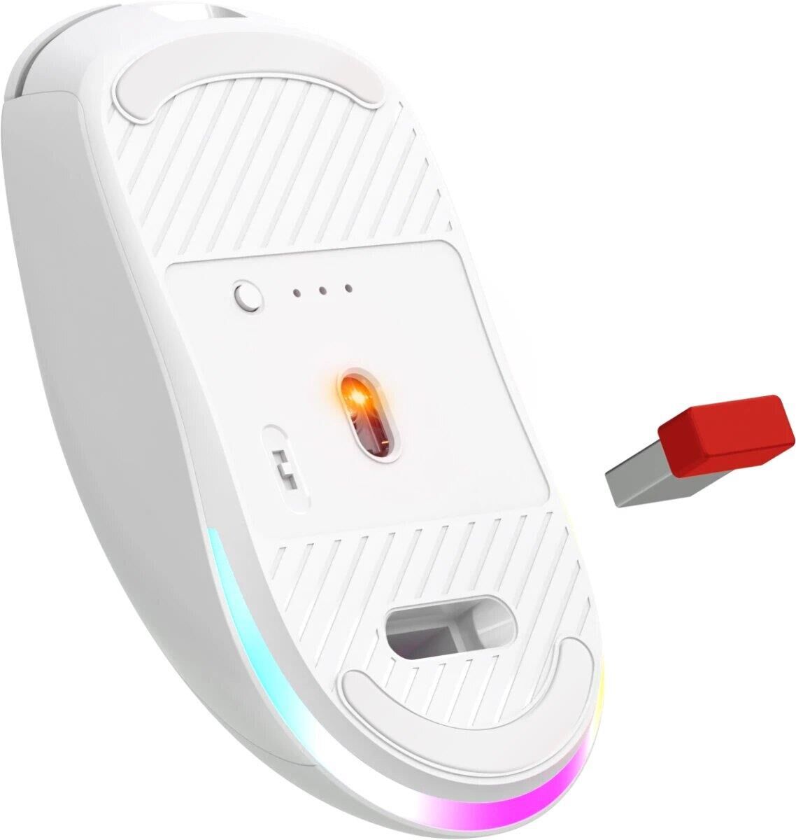 Эргономичная игровая мышь с тремя режимами подключения: проводное, беспроводное по радиоканалу 2.4 Ггц, беспроводное подключение по Bluetooth. Данная модель поддерживает постоянное хранение в памяти двух устройств для подключения по Bluetooth. Также мышь имеет 6 режимов RGB подсветки, встроенный аккумулятор на 400 мАч и тефлоновые ножки для легкого скольжения по поверхности стола.
