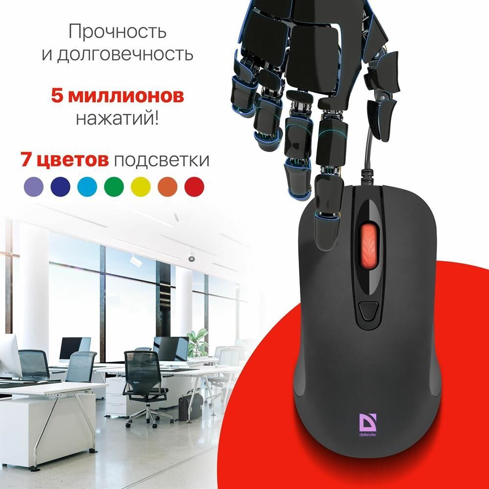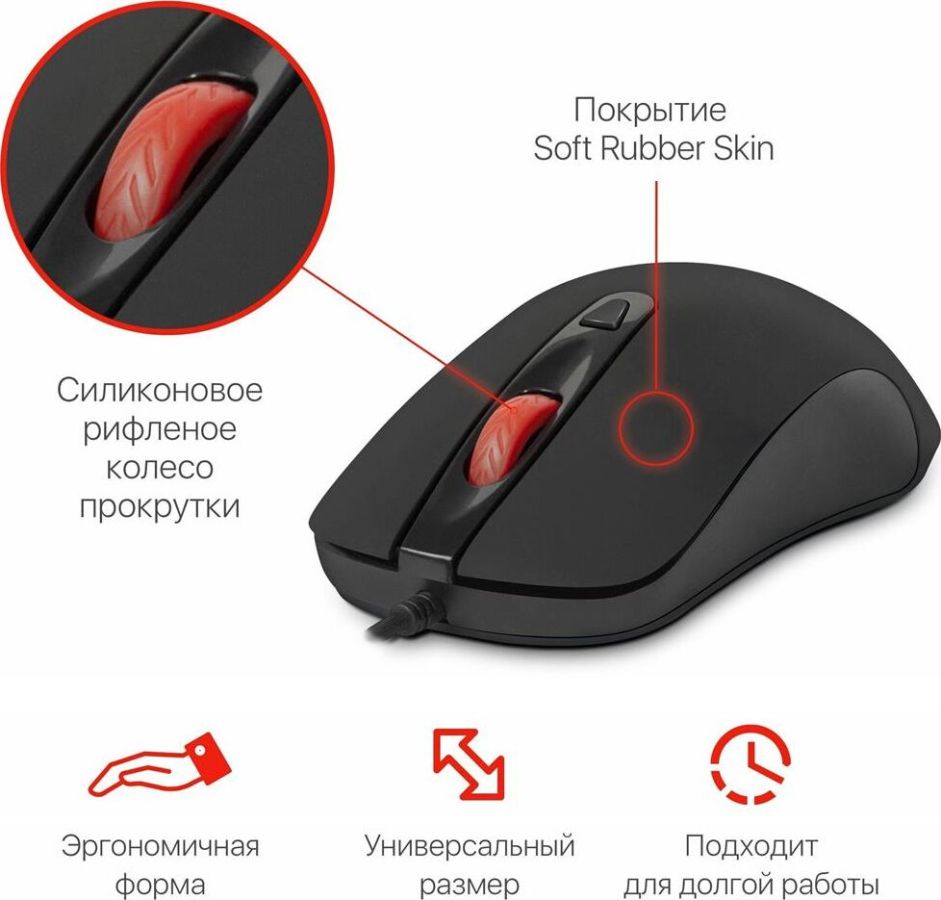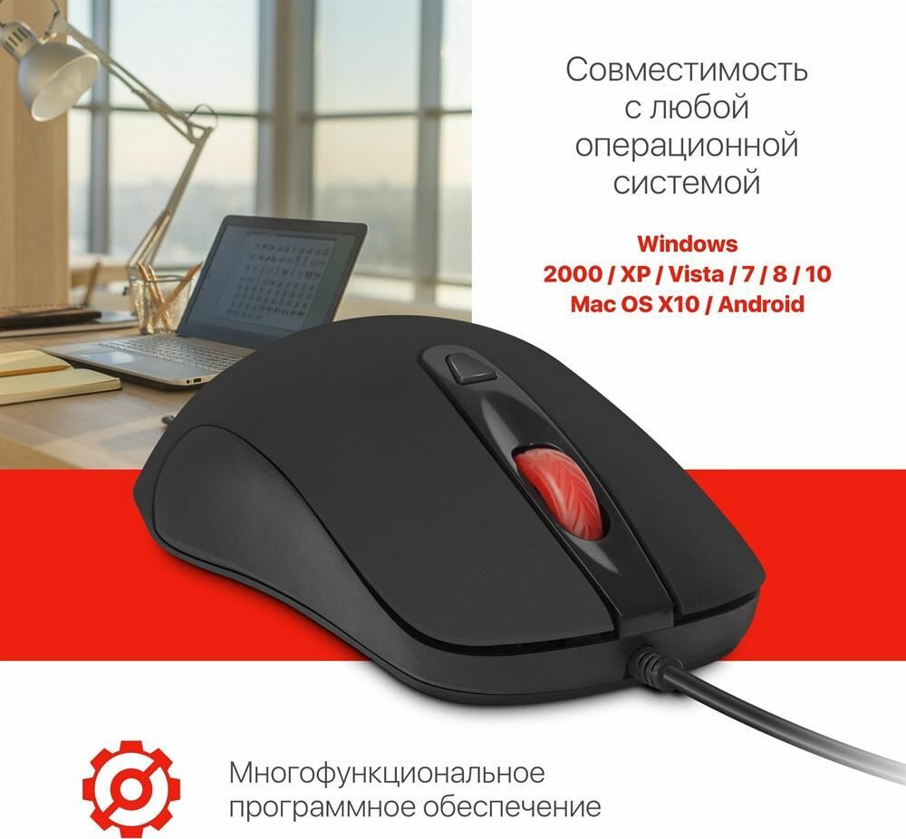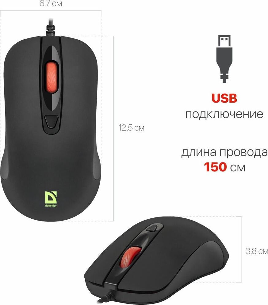 Интерфейс подключения: USB, Длина провода: 2 м, Кнопки: 4+колесо, Разрешение сенсора, макс.: 1200 dpi, Поддержка разрешений: 1000/1200 dpi.