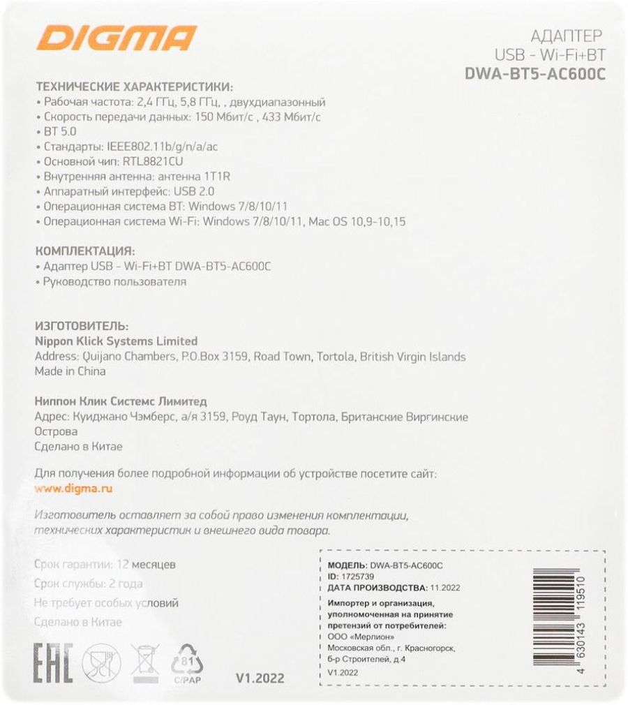 Основные характеристики Класс Wi-FiAC600 Основные характеристики Стандарт передачи данных Wi-Fi + Bluetooth Стандарт Wi-Fi 802.11a Да Стандарт Wi-Fi 802.11b Да Стандарт Wi-Fi 802.11g Да Стандарт Wi-Fi 802.11n Да Стандарт Wi-Fi 802.11n (150 Mbps) Да Стандарт Wi-Fi 802.11n (300 Mbps) Да Стандарт Wi-Fi 802.11ac Да Максимальная скорость Wi-Fi 600 Мбит/с Антенна, тип встроенная Количество антенн 1 Цвет черный Разъемы, интерфейсы Интерфейс с компьютером USB 2.0 Тип разъема USB 2.0 Стандарт Bluetooth 5.0 Особенности Особенности чип RTL8821CU