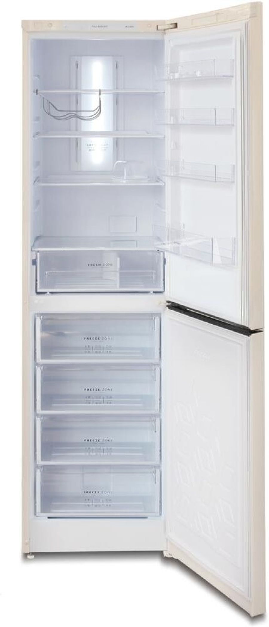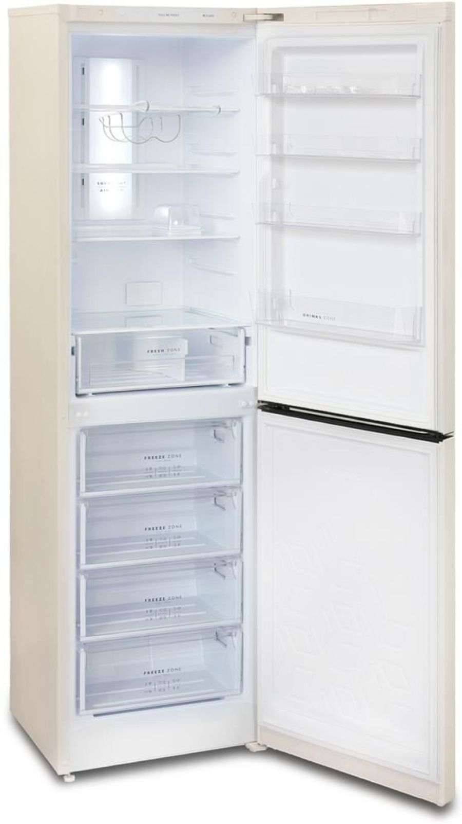 Двухкамерный холодильник с нижней морозильной камерой с системой Full No Frost с дисплеем на двери • габариты 207х60х62,5см • объем 370/240/130л• цвет Бежевый • LED дисплей на двери • система охлаждения Multi Air Flow • регулировка влажности Humidity control • единая зона для овощей и фруктов Fresh Zone с разделителем • полка для бутылок, масленка • LED освещение •