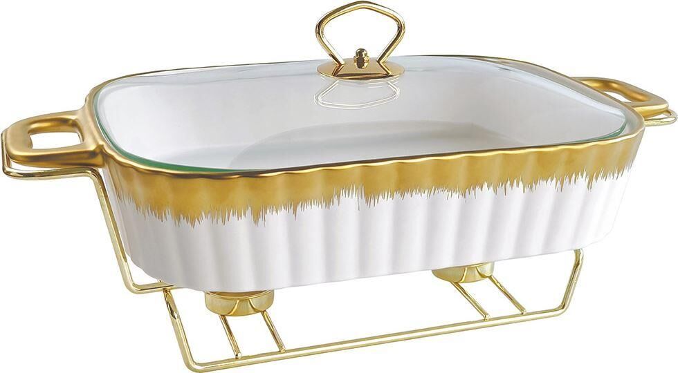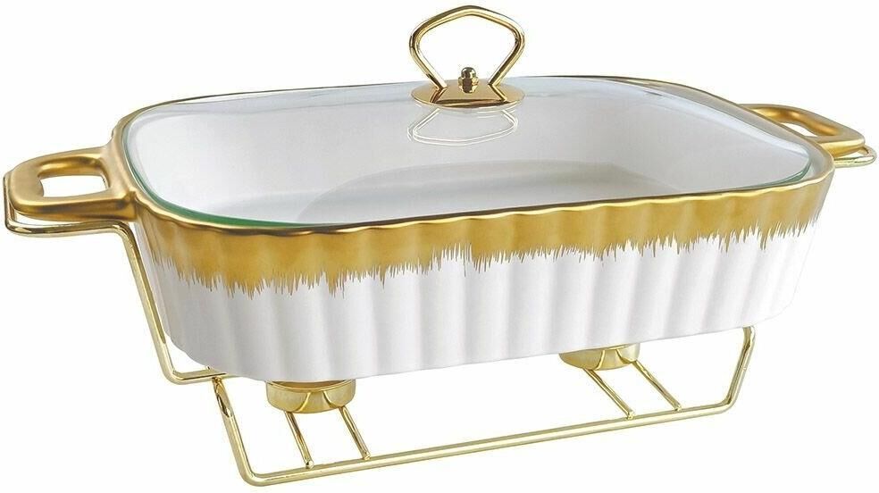 Мармит настольный с подогревом, материал – жаропрочная керамика с декором «под золото», 2,5 литра (38 см), металлическая подставка с двумя подсвечниками "под золото", крышка из жаропрочного стекла, предназначен для сохранения пищи в подогретом виде, подходит для использования в духовом шкафу.
