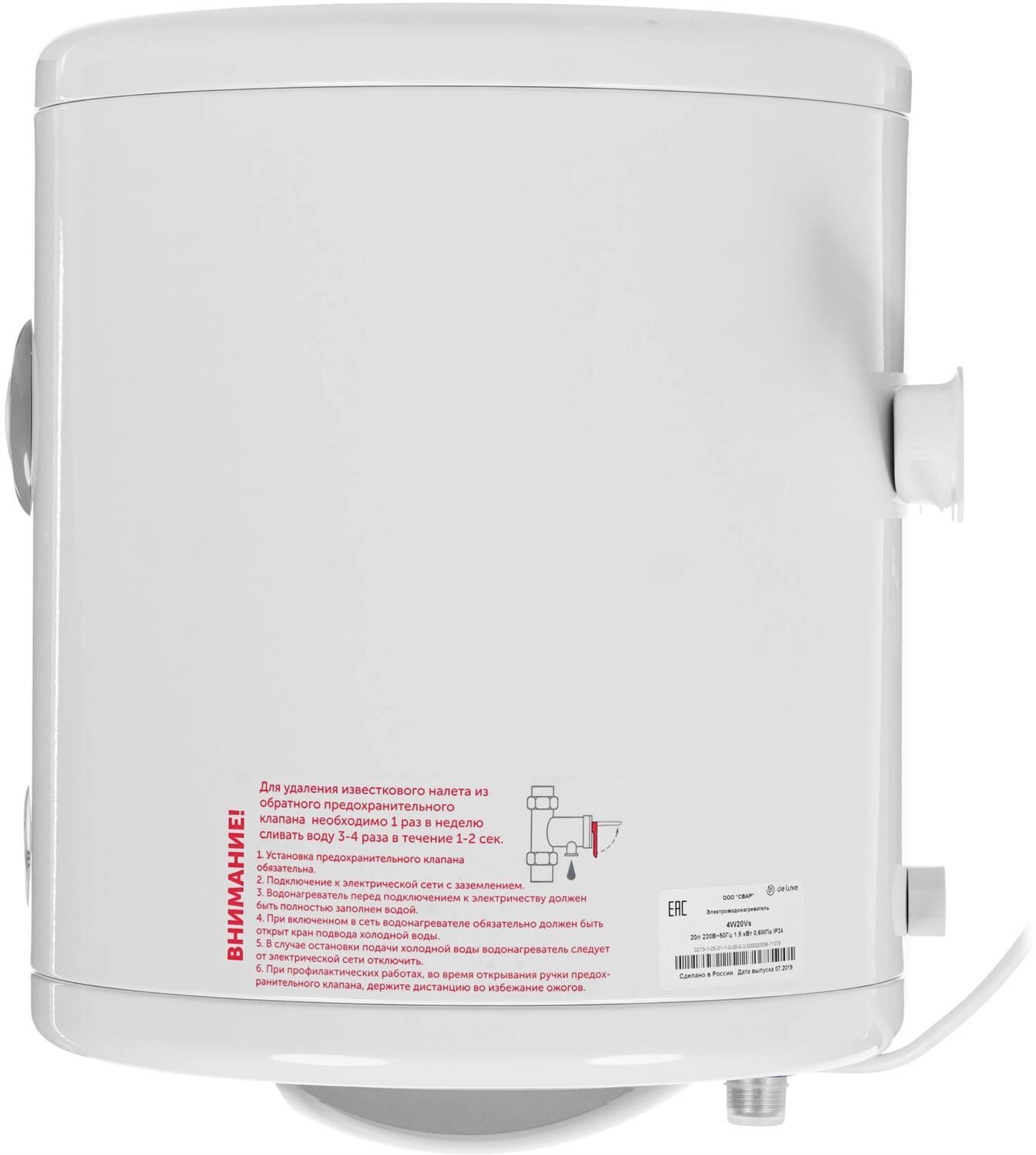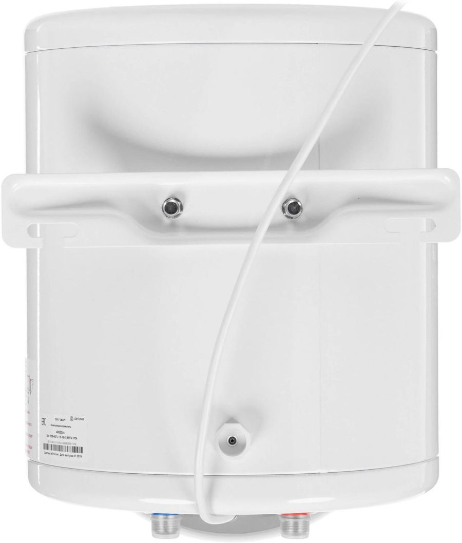 Система поддержания температуры. Световая индикация включения и подогрева. Система полной безопасности СПС безопасности. Антикоррозийный магниевый анод. Предохранительный клапан. Слой теплоизоляции, снижающий тепло- и энергопотери. Внутренний бак из нержавеющей стали Super Strong Inox. Комплектация: Электрический кабель с вилкой. Анкерные болты с гайкой. Предохранительный клапан. Техническое описание: Цвет - белый. Мощность - 1,5 кВт. Объём, л - 20. Размеры, мм - высота/диаметр – 414/330. Вес, кг - 11.
