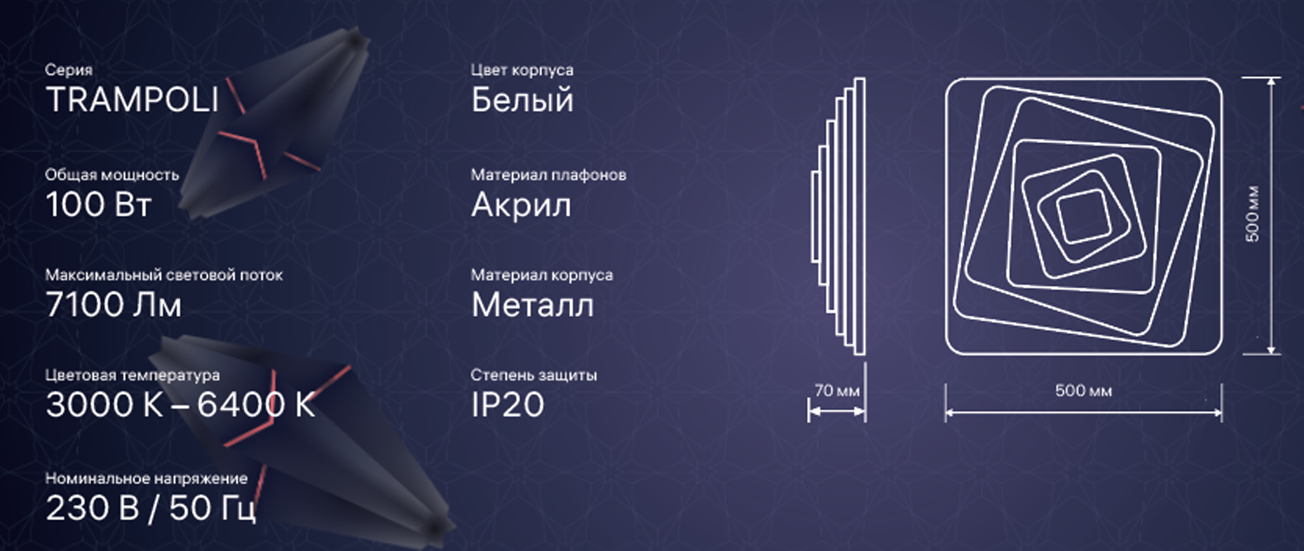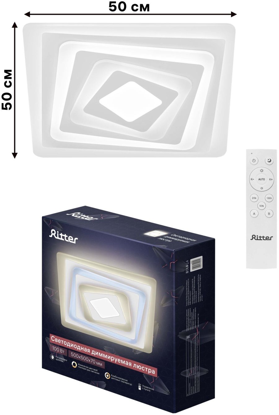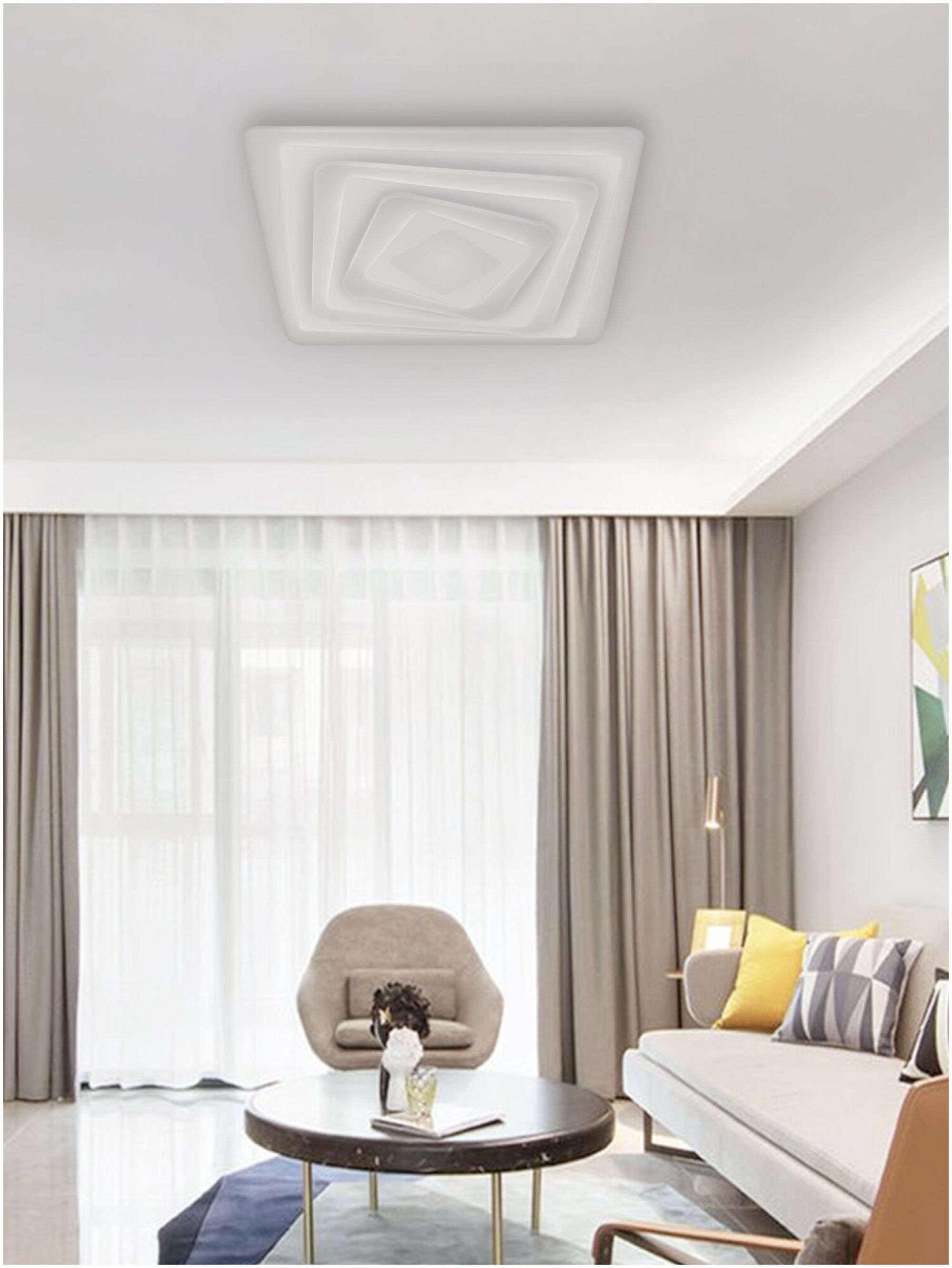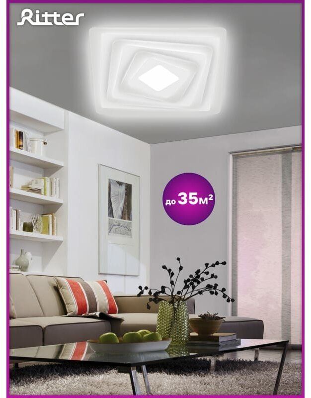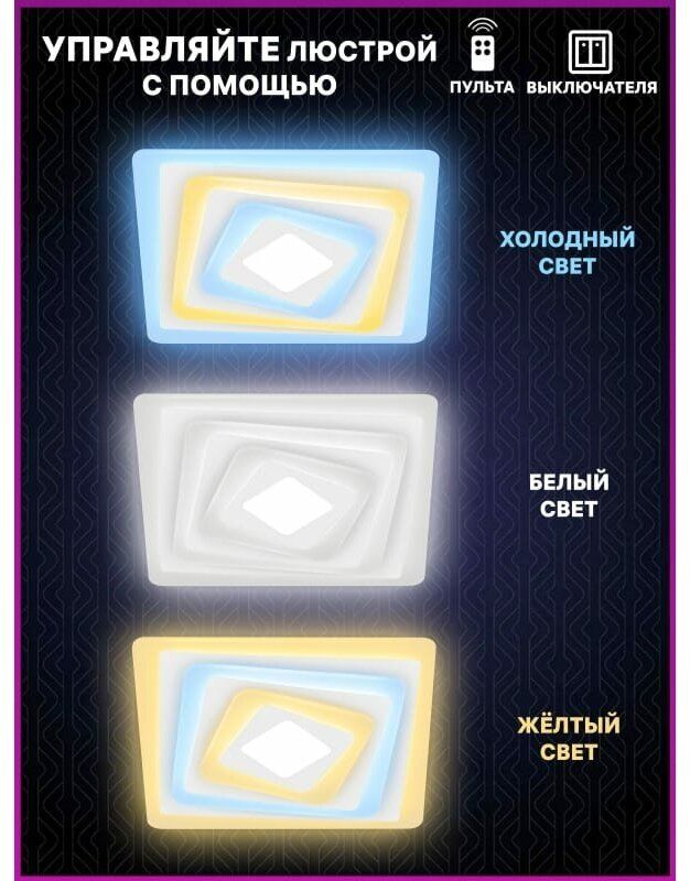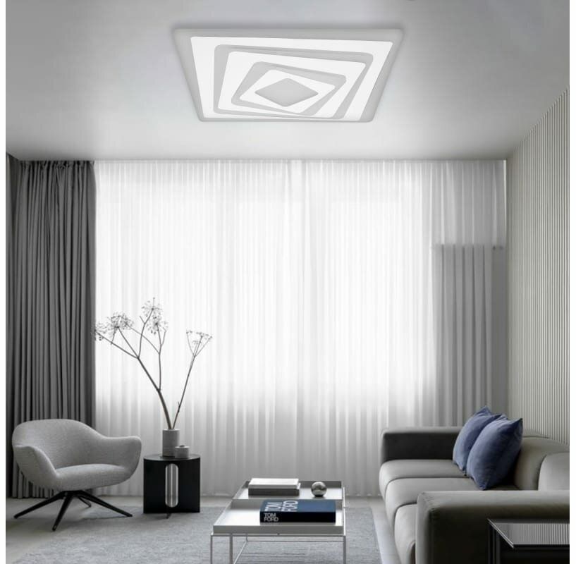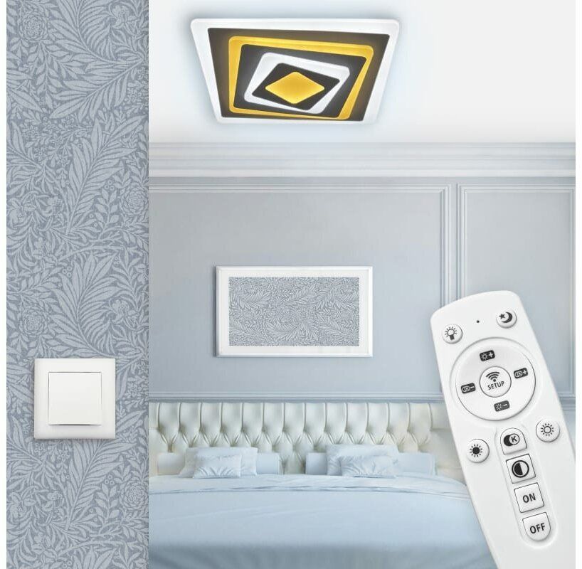Светодиодная диммируемая люстра предназначена для основного освещения жилых помещений (детской, гостиной, кухни, спальни площадью до 41 м²). Благодаря большой площади пространства, излучающей свет, люстра имеет хорошую равномерность освещения без характерных для традиционных люстр теней и зон повышенной яркости. Богатый функционал люстры позволяет осуществлять регулировки схем цветовой температуры и яркости. Режим «ночник» обеспечивает мягкую и комфортную подсветку комнаты в ночное время. В комплект входит эргономичный пульт дистанционного управления, позволяющий включать и выключать люстру, а также устанавливать необходимые параметры освещения.
