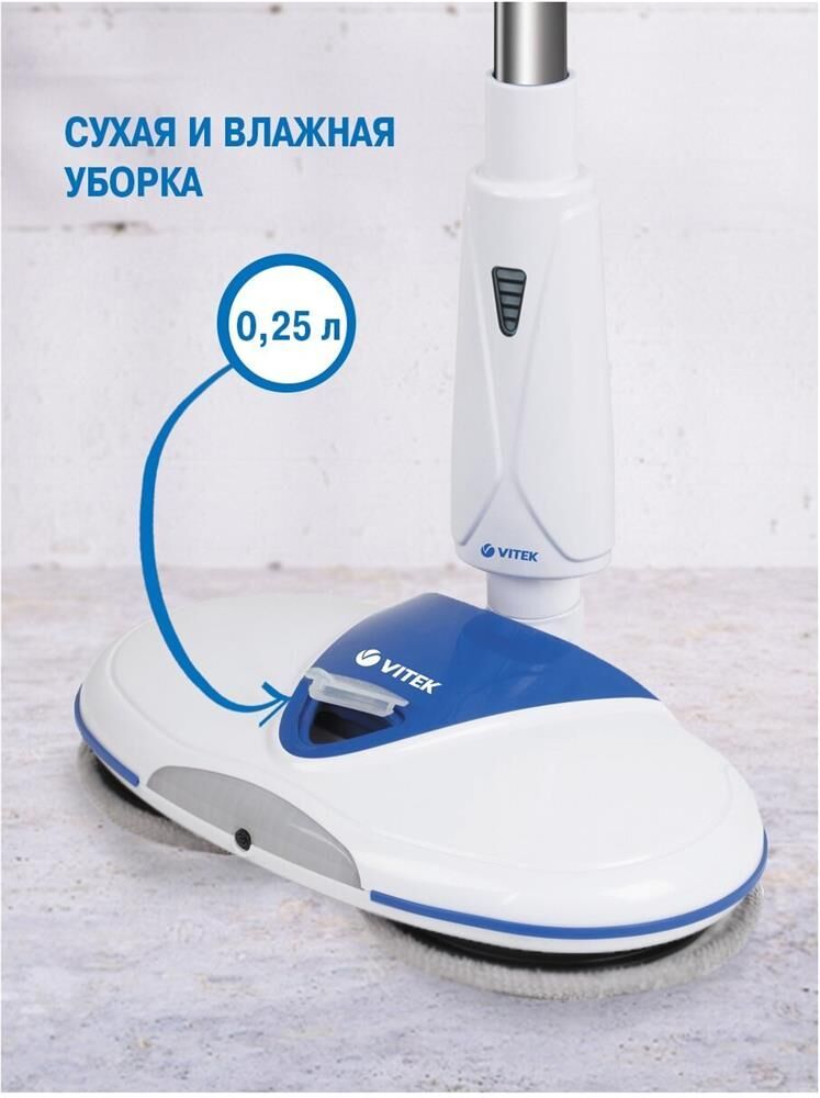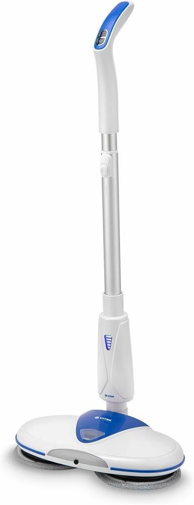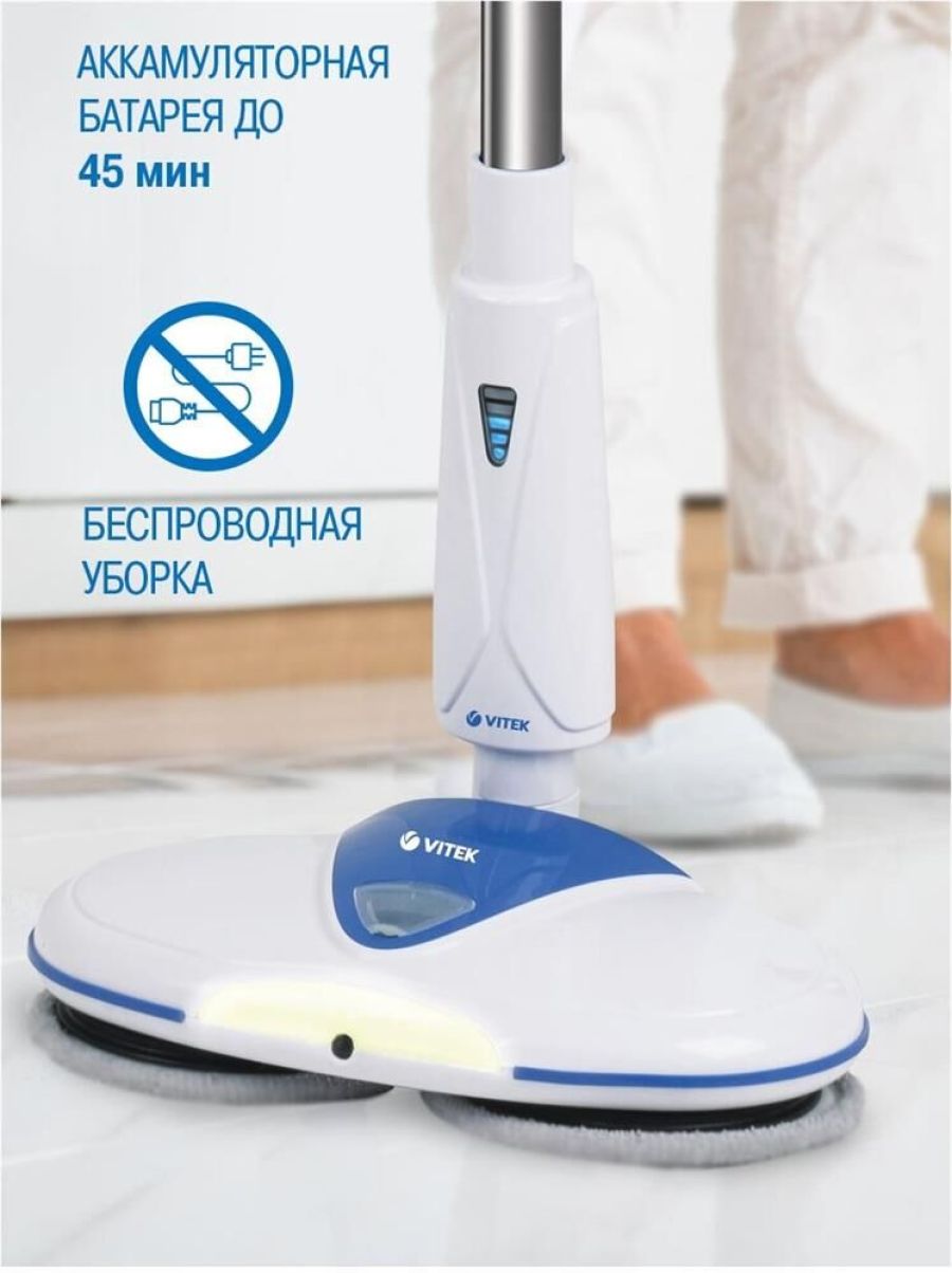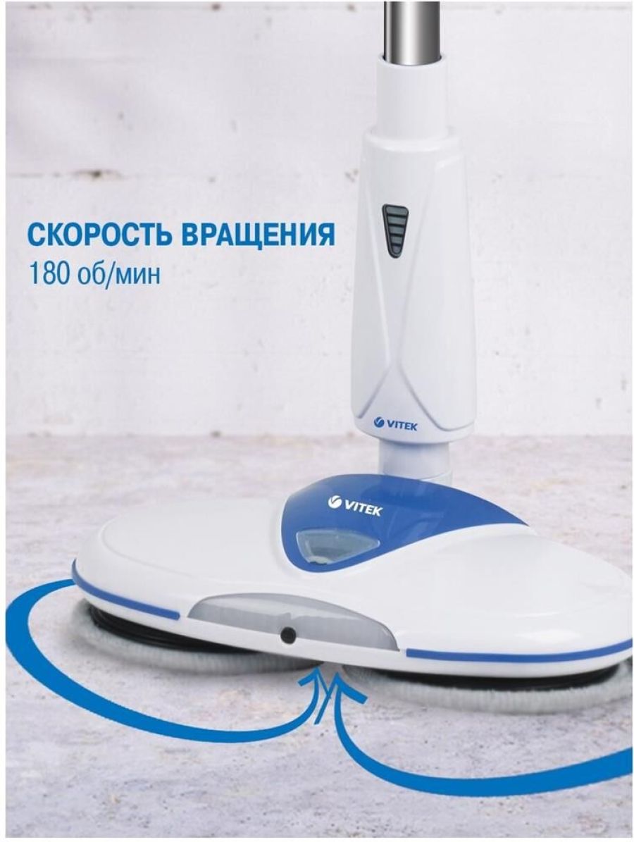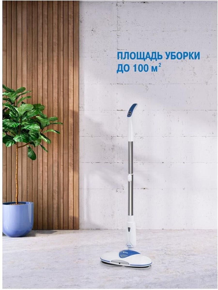 Электрошвабра. Максимальная мощность: 50 Вт, Время работы от аккумулятора: 25-45 минут, Время зарядки аккумулятора: 4 часа, Материал трубки: алюминий, Индикатор уровня заряда, Разбрызгиватель для воды: механический, Скорость вращения: 180 об/мин., Объем резервуара для воды: 0,25 литра, Площадь уборки: 90-100 м2, Питание: Аккумуляторная батарея, Электропитание: 11,1 В 2200 мАч, Цвет: Белый/синий