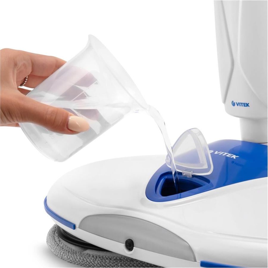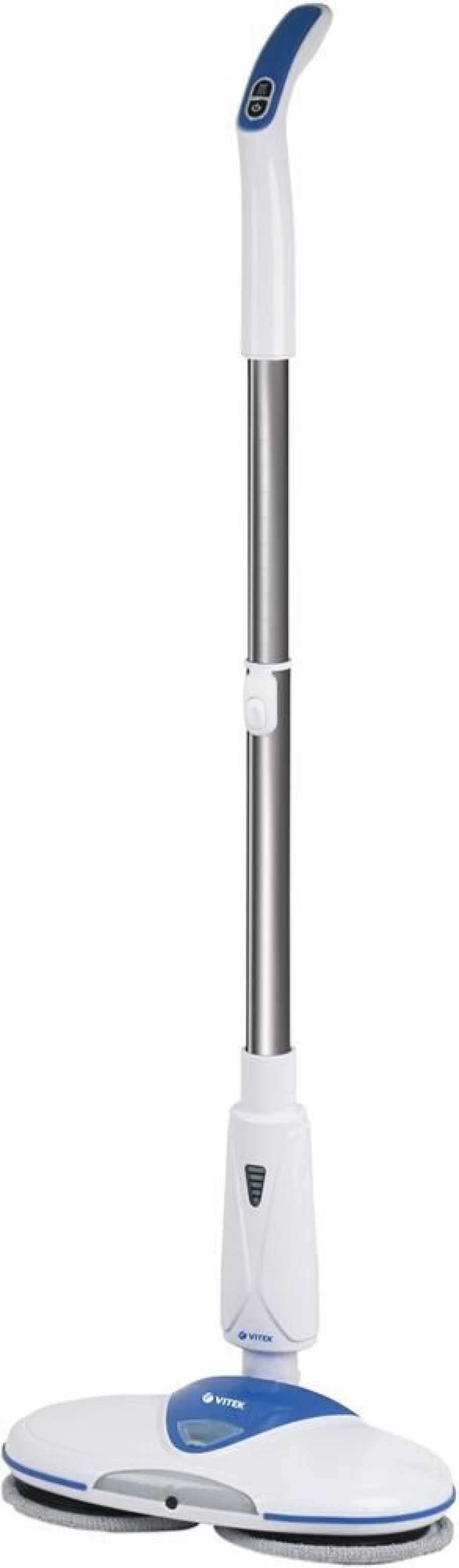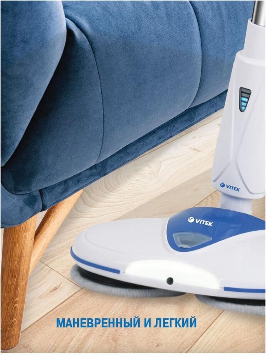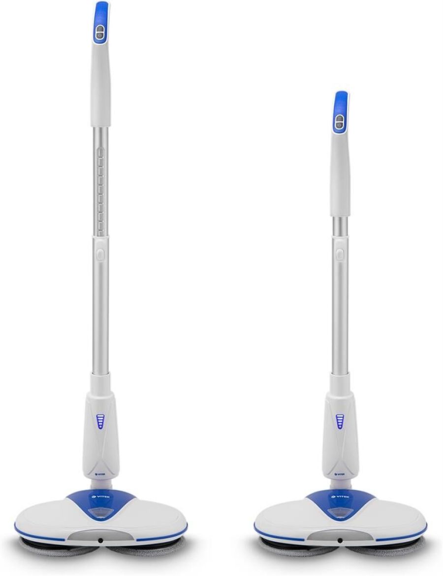 Электрошвабра. Максимальная мощность: 50 Вт, Время работы от аккумулятора: 25-45 минут, Время зарядки аккумулятора: 4 часа, Материал трубки: алюминий, Индикатор уровня заряда, Разбрызгиватель для воды: механический, Скорость вращения: 180 об/мин., Объем резервуара для воды: 0,25 литра, Площадь уборки: 90-100 м2, Питание: Аккумуляторная батарея, Электропитание: 11,1 В 2200 мАч, Цвет: Белый/синий