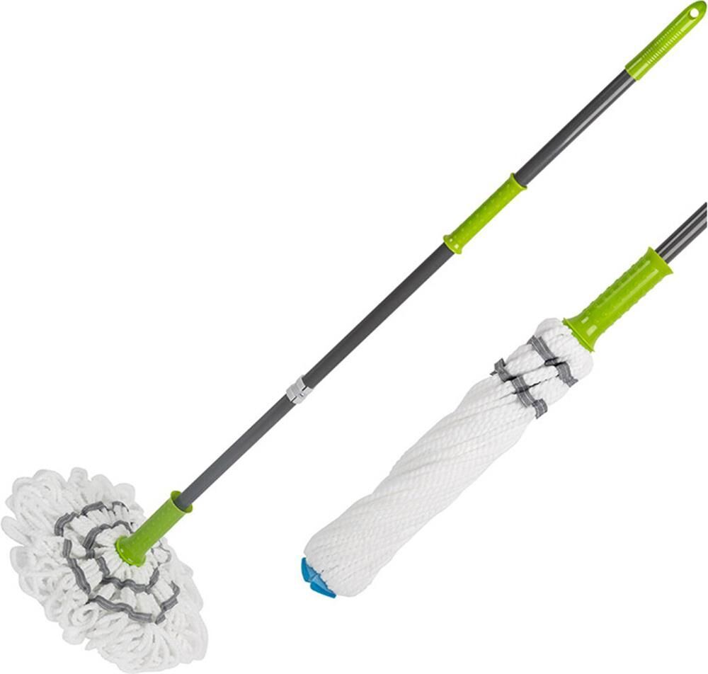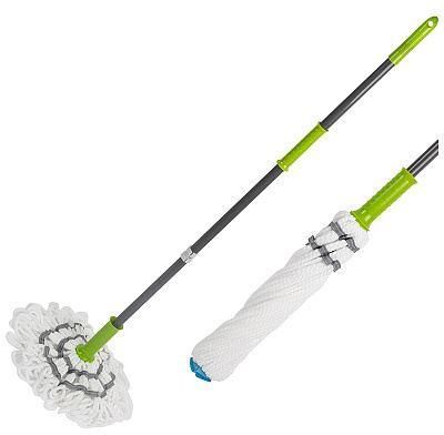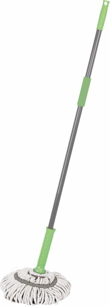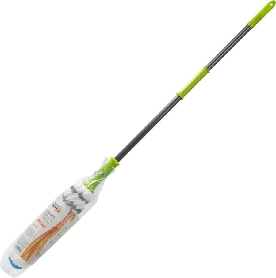 Швабра снабжена механизмом отжима (насадка скучивается и отжимается, при этом нет необходимости ее снимать и пачкать руки). Предназначена для мытья полов. Длина швабры: 120 см; Материал: железо, полипропилен, микрофибра.
