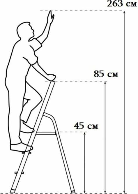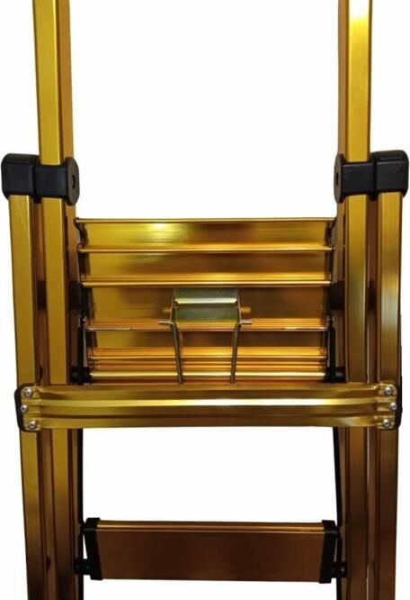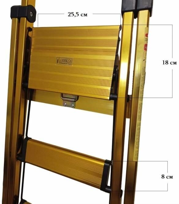 Стремянка 2 х ст бытовая алюминиевая с анодированным покрытием золотистого цвета высота рабочей площадки 45 см вес 2 кг Максимальная нагрузка 150 кг. Рабочая высота 263 см ширина 45 см