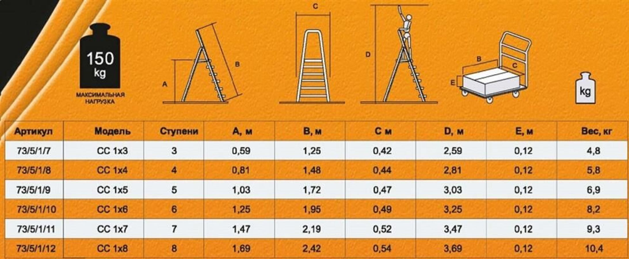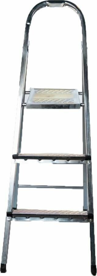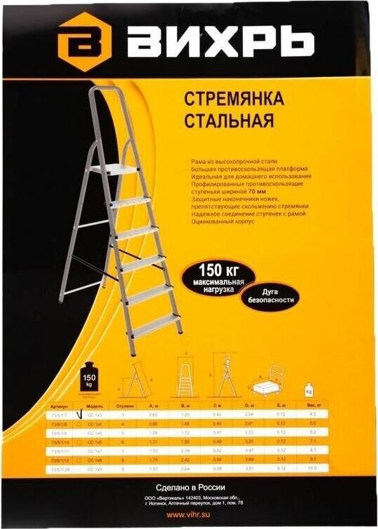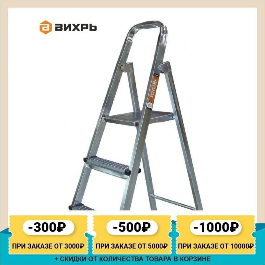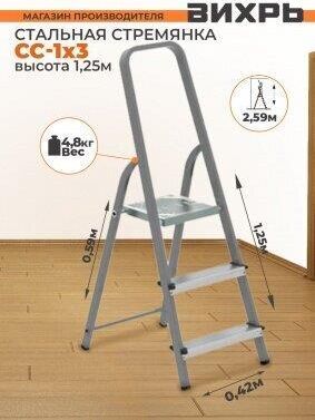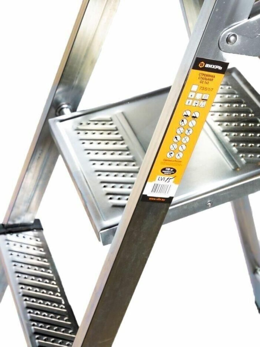 Стальная стремянка Вихрь СС 1х3 73/5/1/7 используется в быту. Имеет три широкие рифленые ступеньки. Широкая площадка позволяет удобно стоять и выполнять работу. В сложенном состоянии модель занимает мало места, что удобно при хранении. Устойчивость обеспечивается противоскользящими заглушками. Рабочая высота, м 2,59. Высота площадки, м 0,64. Размер в сложенном состоянии, см 106х42. Количество ступеней, шт 3. Материал сталь. Max рабочая нагрузка, кг 150. Общая длина, м 1,06. Кол-во ступеней по одной стороне, шт 3. min длина в сложенном состоянии, м 1,06. Широкие ступени да. Телескопическая/выдвижная нет. Ширина лестницы, мм 420. Лоток для принадлежностей нет. Тип стремянка. Вес нетто, кг 4,5. Габариты без упаковки, мм 1060х420. Толщина профиля, мм 0.8-1.
