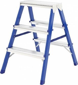 Складная стремянка с окрашенным порошковой эмалью стальным профилем оснащенным ступеньками с двух сторон и верхней рифленой противоскользящей площадкой которое можно использовать как сидение.страховочные ремни для дополнительной устойчивости и предотвращения складывания и пластиковые наконечники на ножках предотвращающие скольжение высота ступеньки 43 см габариты в сложенном виде 48х42х16 предельно допустимая нагрузка 150 кг с учетом динамической нагрузки. Цвет в ассортименте (синий, красный, серебристый)