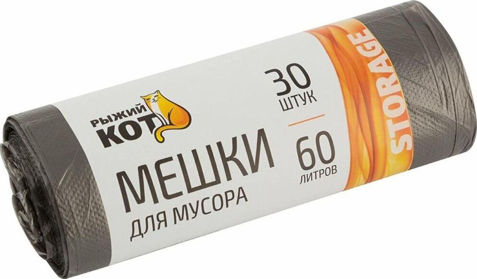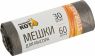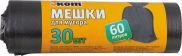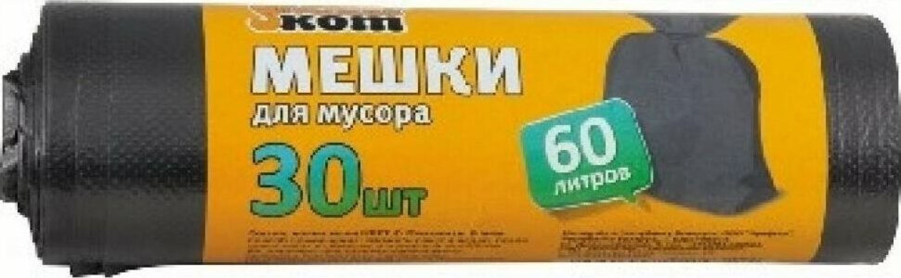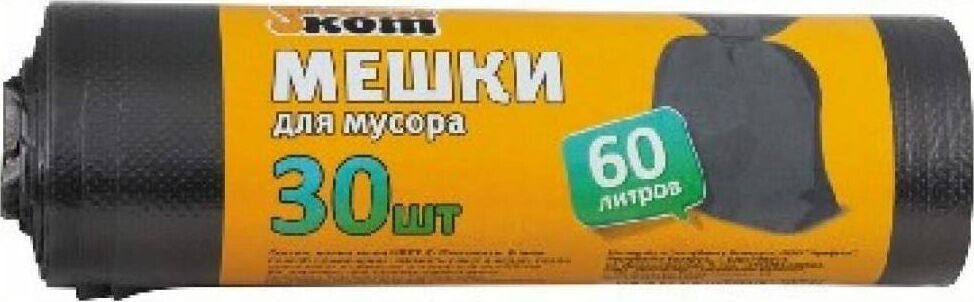 В рулоне: 30 штук Размер мешка: длина 560мм, ширина 680мм, плотность 6 мкм Объем: 60 литров Материал: полиэтилен низкого давления