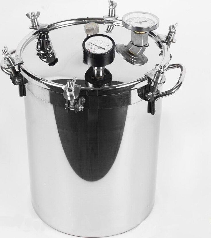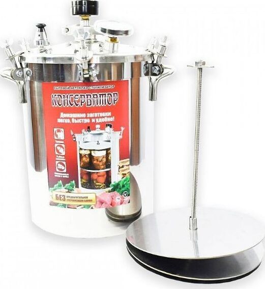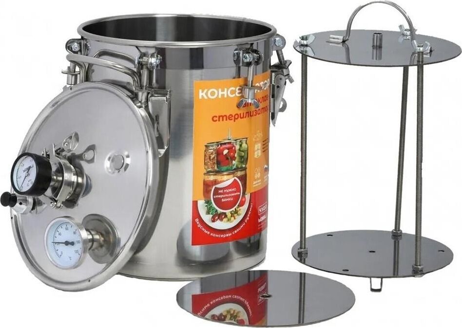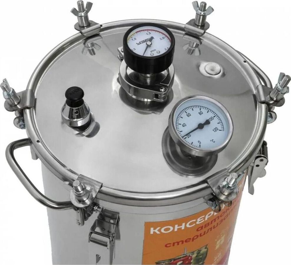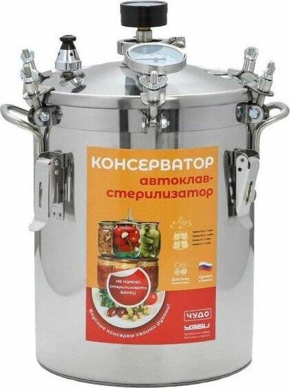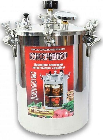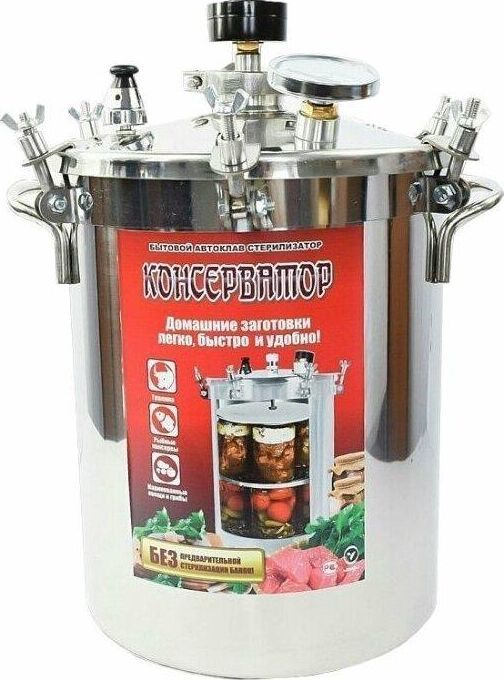 Глубина: 25 см Ширина (см)..: 25 Высота (см): 34 Цвет: нержавеющая сталь Вес (кг): 5.5 Объем (л): 14 Материал: пищевая нержавеющая сталь Вместимость банок: 0,5 л. - 8 шт, 0,7 л. - 4 шт, 1,0 л. - 3 шт, 3л. - 1 шт. Можно использовать 1,5л, и 2л. Нагрев Температура консервации: 102-112С° Тип плит: все, включая индукционные Узел автоматического сброса избыточного давления Контроль температуры Контроль давления Манометр Термометр Комплектация: термометр,манометр,клапан избыточного давления Особенности: капсульное дно, кламповое соединение 1,5 дюйма
