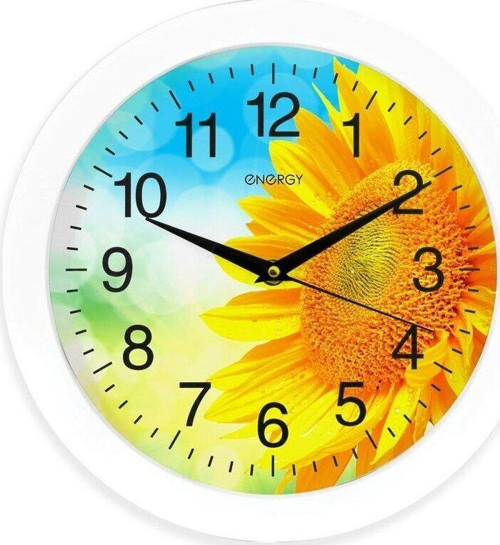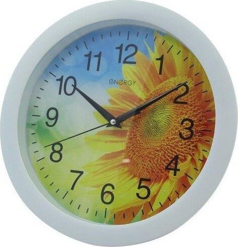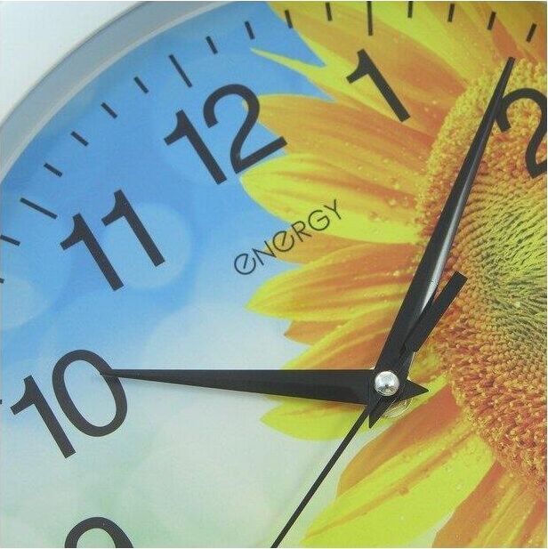 Часы настенные кварцевые ENERGY модель ЕС-97 подсолнух. Питание от 1 батарейки типа АА (в комплект не входят). Напряжение: 1 х АА 1.5В. Размер 27,5*3,8 см. Корпус: пластик. Плавный ход.
