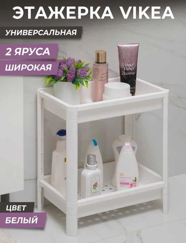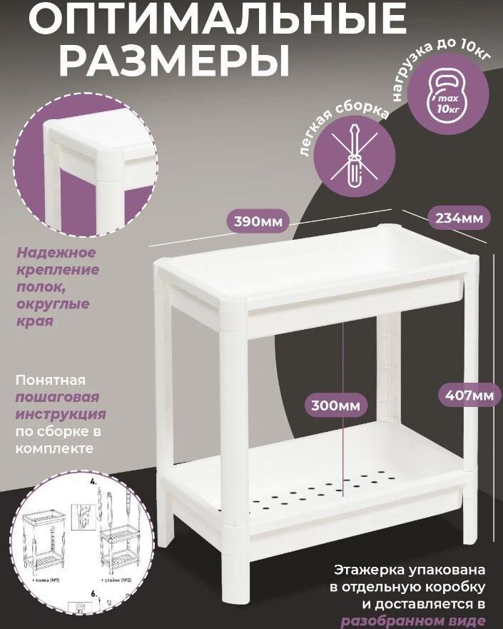 Этажерка для хранения вещей VIKEA - это идеальное решение для организации пространства на Вашей кухне и в ванной, в гостиной и на балконе, а также в любом другом помещении. Этажерка для кухни состоит из 2х ярусов, очень удобная и компактная, но в тоже время вместительная, прекрасно впишется в пространство любой комнаты. Стеллаж имеет оптимальное расстояние между полками. Это позволяет разместить все самые необходимые полезные в хозяйстве мелочи. Тип этажерка Конструкция открытая конструкция Количество полок 2 Материал корпуса пластик Материал полок пластик, полипропилен Ширина 39 см Глубина 23.4 см Высота 40.7 см Габариты транспортной упаковки 41х24х12 см Вес в транспортной упаковке 0.99 кг