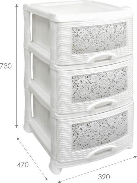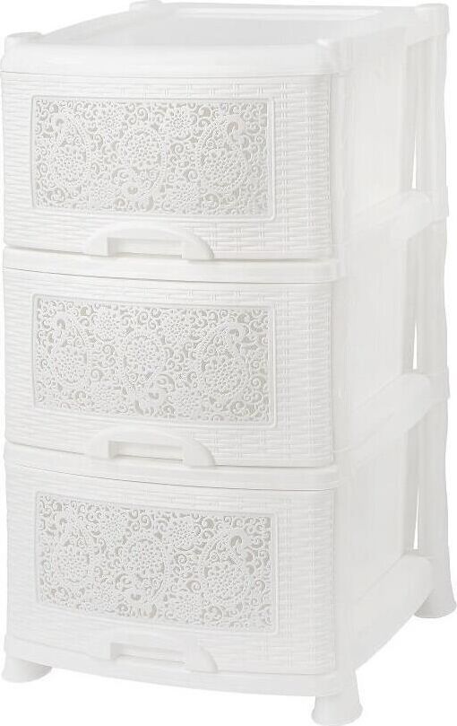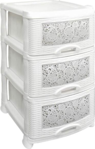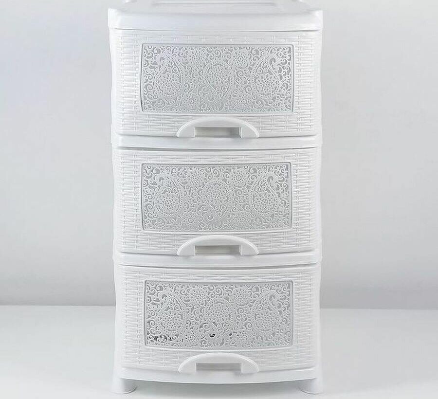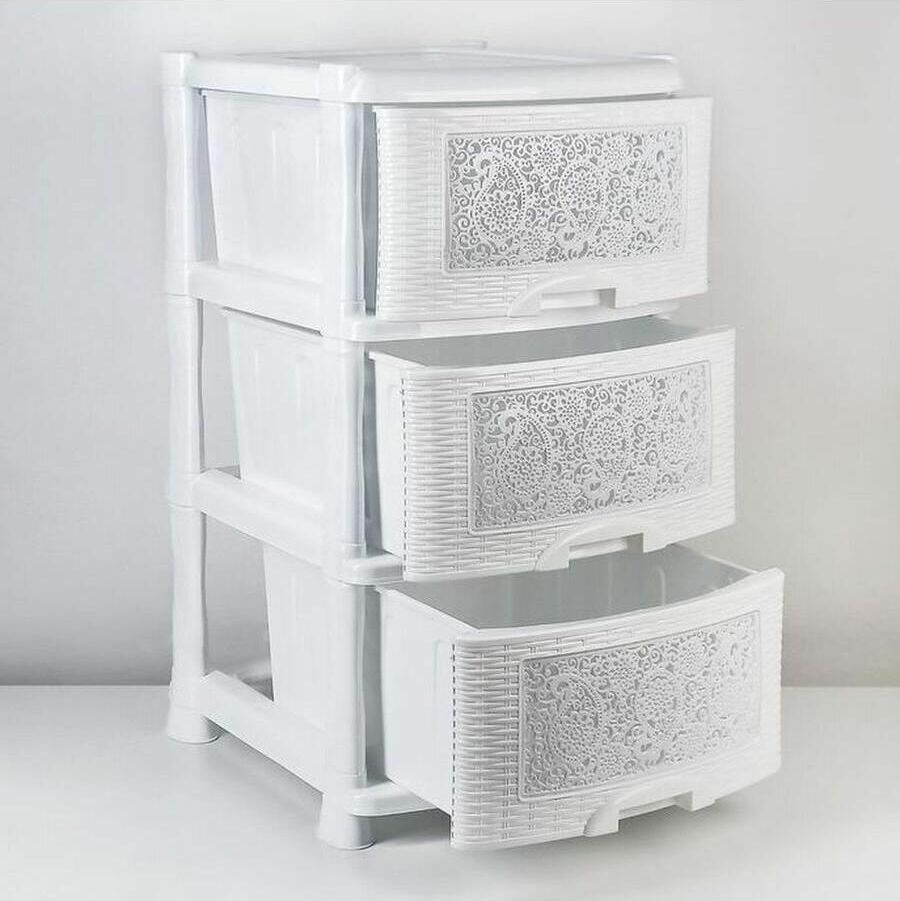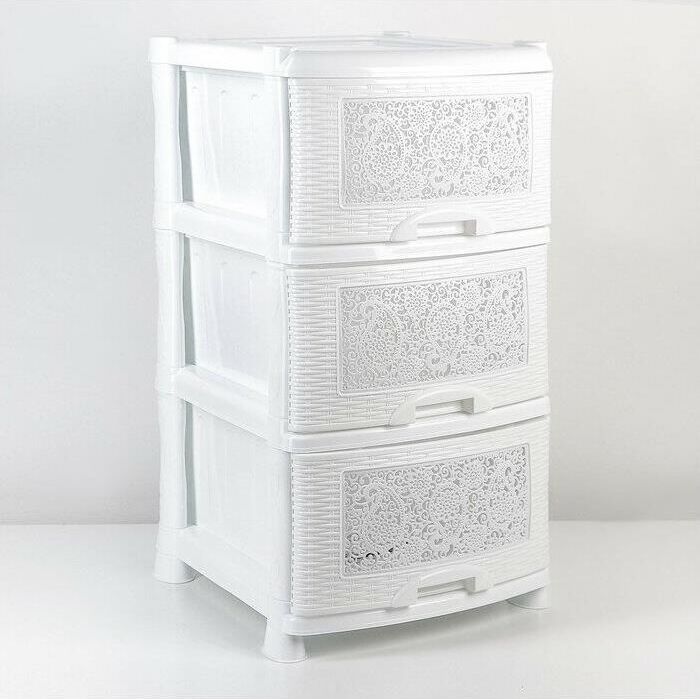 Цвет белый. Размер 470 x 390 x 730 мм. Материал Полипропилен. Комод из пищевого пластика с тремя выдвижными ящиками предназначен для хранения вещей и продуктов питания и гармонично впишется в интерьер любой комнаты. Легкий и вместительный комод поможет обеспечить порядок, избавит от разбросанных игрушек или одежды, убережет продукты от пыли и заветривания. Узор на передних панелях придаст индивидуальность и подарит настроение. Не рекомендуется размещение пластикового комода вблизи батарей центрального отопления и электрических обогревателей.