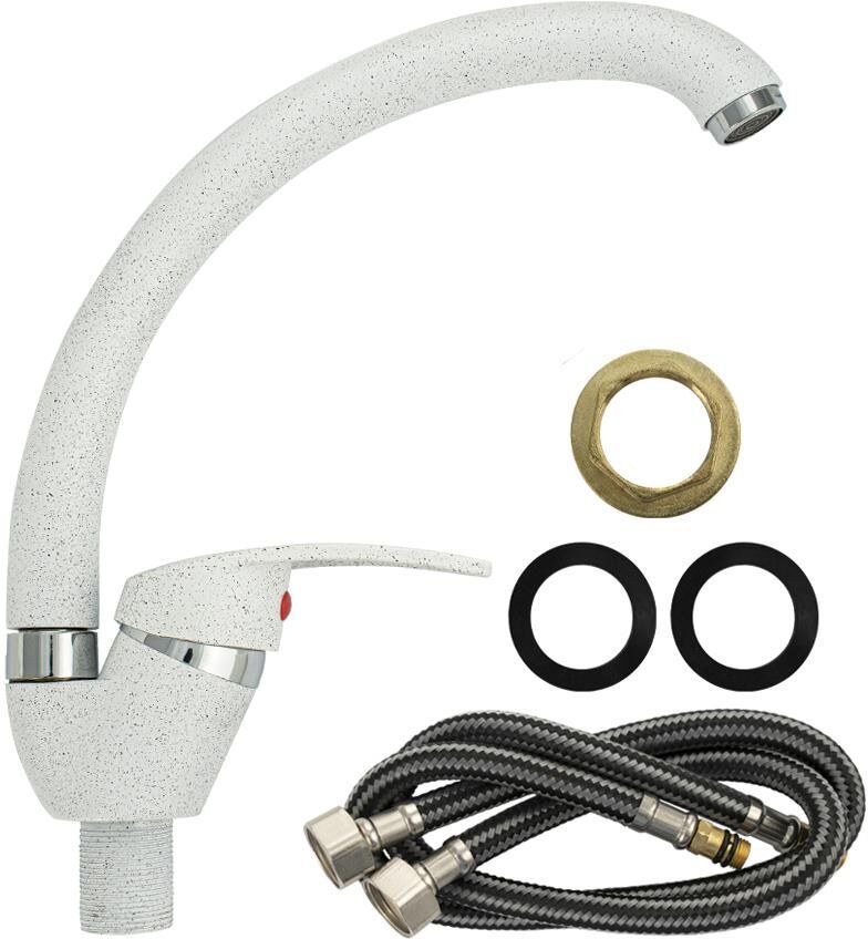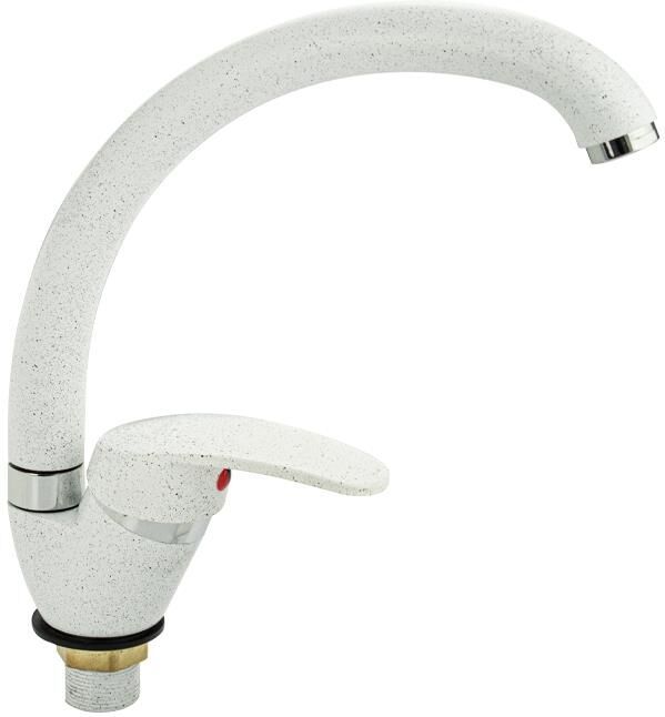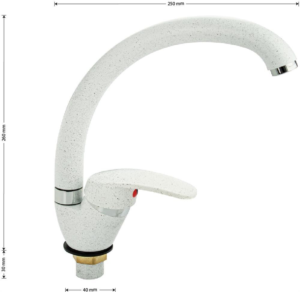 Смеситель для кухонной мойки и раковин, литой матовый корпус, из нержавеющей стали и аллюминия, с С - образным изливом, шаровый. Цвет белая эмаль с вкраплениями. Крепление резьба - гайка, картридж d = мм, ручка литая. Аэратор для экономии воды. Такая модель может использоваться на домашней кухне, на даче, в медицинских учреждениях и общественных местах. Габаритные размеры: высота 260 мм, длина 250 мм, диаметр посадочного седла 40 мм, длина резьбы 30 мм, длина подводки 400 мм. Вес - 0,65 кг, объём - 0,00357 м3. В комплекте паспорт, корпус с изливом, подводка 1/2, крепеж, набор прокладок.
