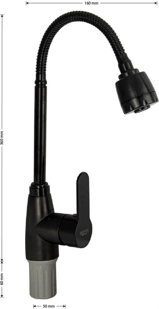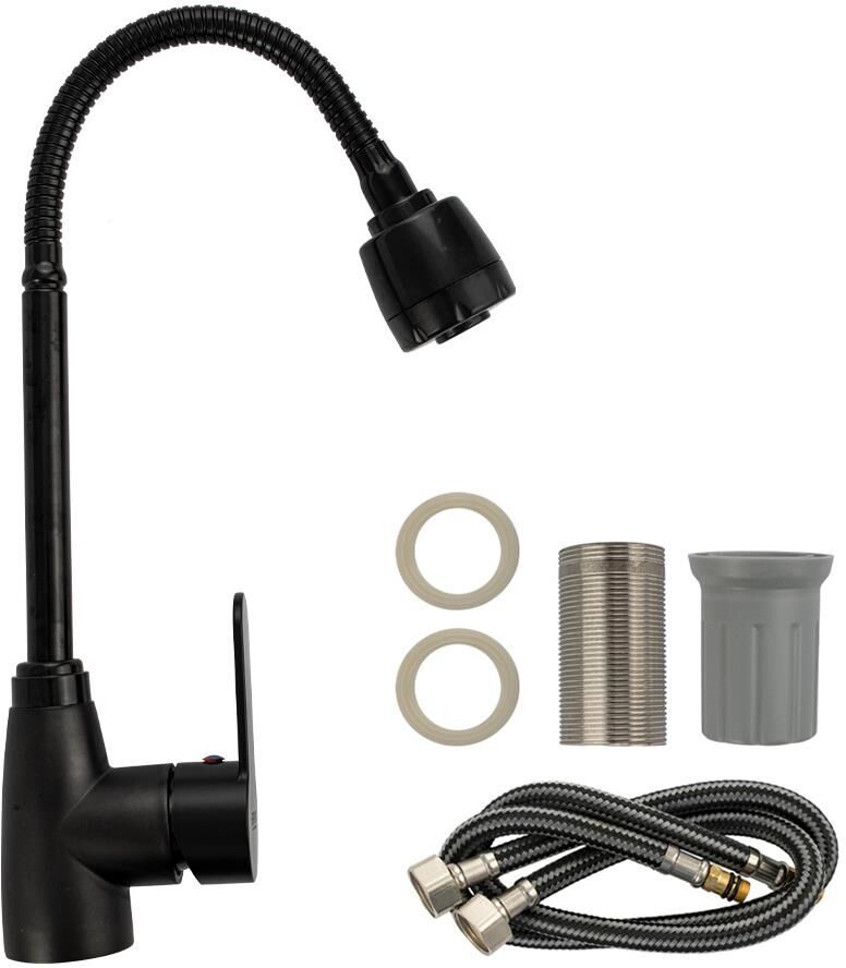 Смеситель для кухонной мойки и раковин, из высокопрочного пластика АБС, черный, боковой, с гибким изливом,с большим двухрежимным аэратором, шаровый. Крепление резьба - гайка, картридж d = мм, литая ручка. Аэратор для экономии воды. Габаритные размеры: высота 360 мм, длина 160 мм, диаметр посадочного седла 50 мм, длина резьбы 60 мм, длина подводки 450 мм. Вес - 0.71 кг, объём - 0.00385 м3. В комплекте паспорт, корпус с изливом, пластиковая подводка с латунными штуцерами 1/2, крепеж, набор прокладок.
