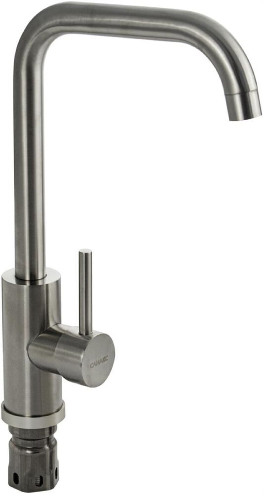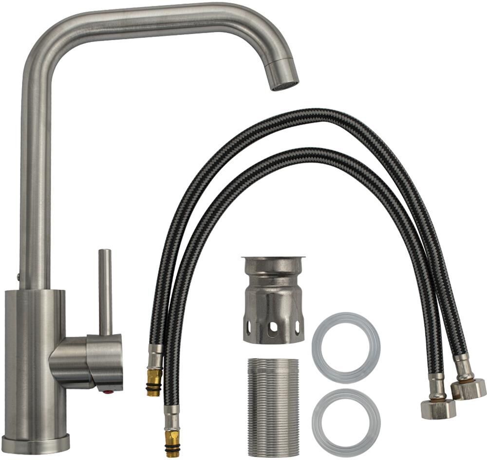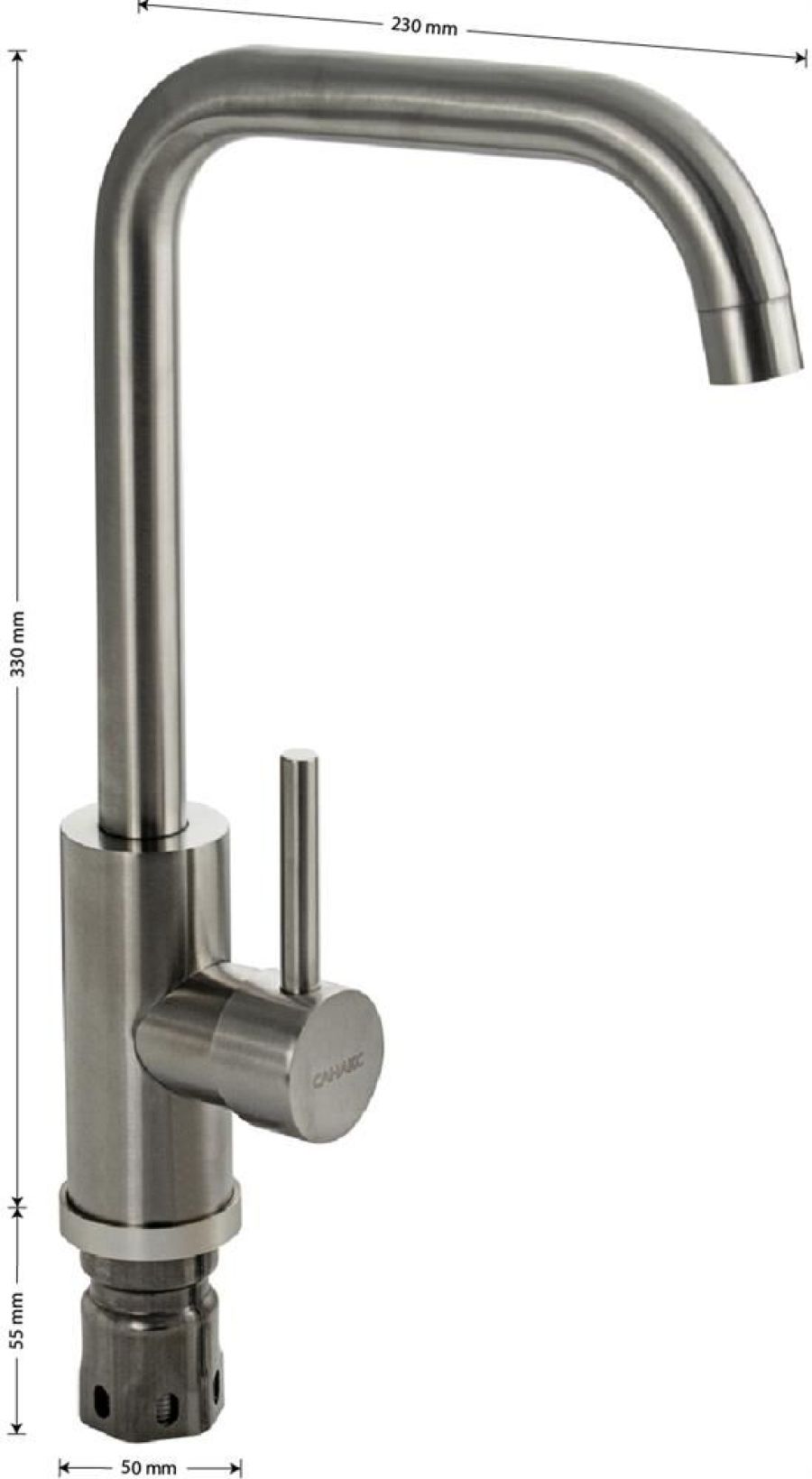 Смеситель для кухонной мойки и раковин, литой матовый корпус, из нержавеющей стали марки 304, с высоким П-образным изливом, шаровый, Крепление резьба - гайка, картридж d = мм, ручка литая. Аэратор для экономии воды. Такая модель может использоваться на домашней кухне, на даче, в медицинских учреждениях и общественных местах. Габаритные размеры: высота 330 мм, длина 230 мм, диаметр посадочного седла 50 мм, длина резьбы 55 мм, длина подводки 500 мм. Вес - 1 кг, объём - 0.00516 м3. В комплекте паспорт, корпус с изливом, подводка 1/2, крепеж, набор прокладок.