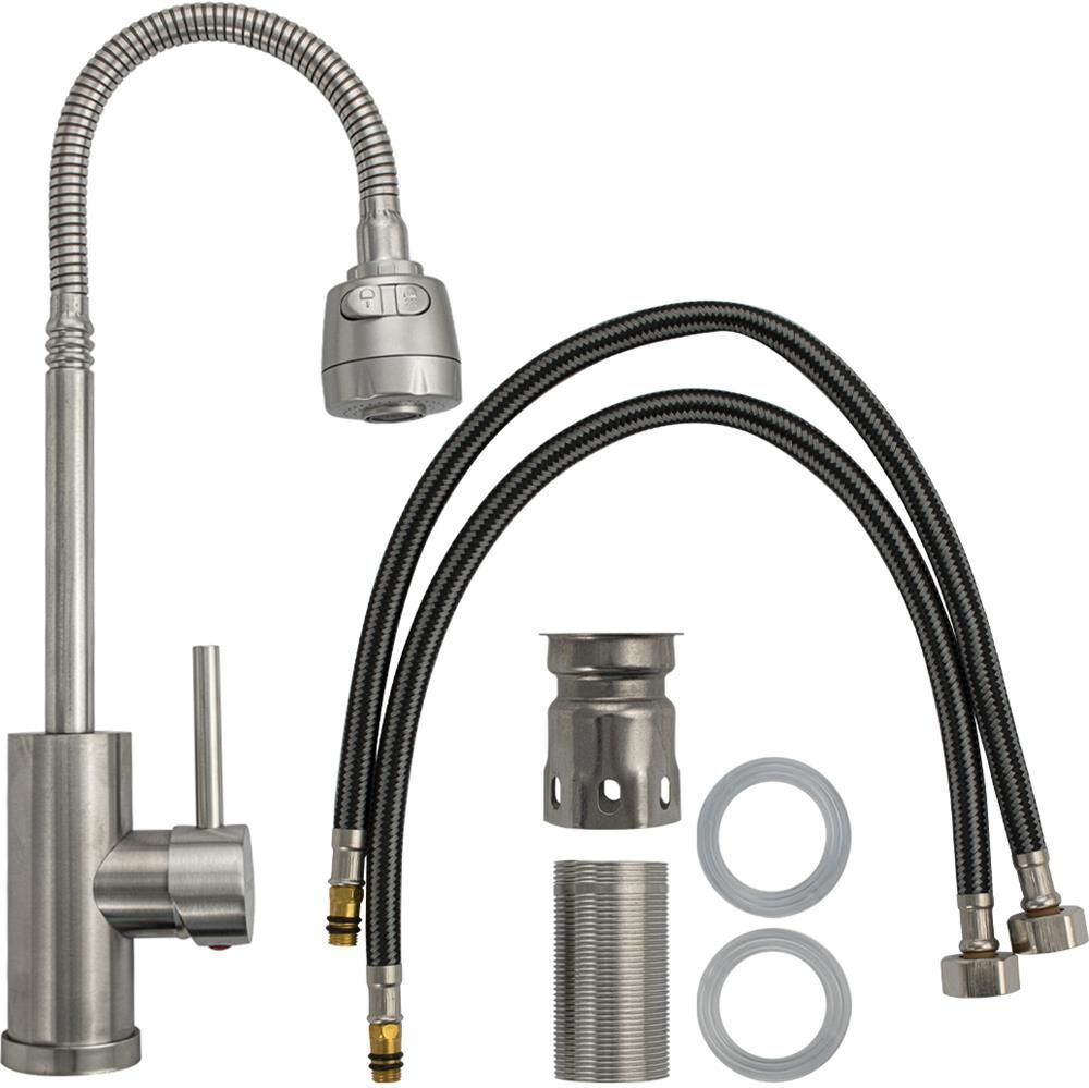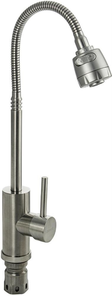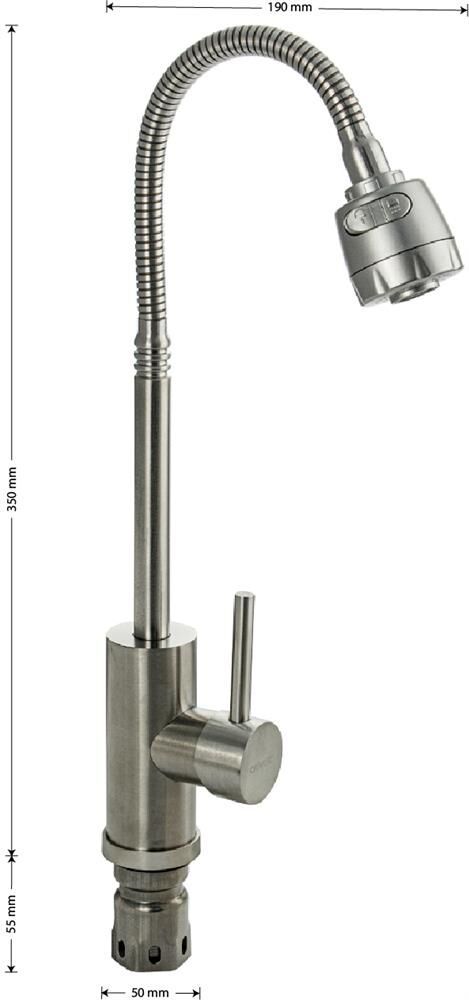 Смеситель для кухонной мойки и раковин, литой матовый корпус, из нержавеющей стали марки 304, с высоким гибким изливом, с большим двухрежимным аэратором для экономии воды, шаровый. Крепление резьба - гайка, картридж d = мм, ручка литая. Такая модель может использоваться на домашней кухне, на даче, в медицинских учреждениях и общественных местах. Габаритные размеры: высота 350 мм, длина 190 мм, диаметр посадочного седла 50 мм, длина резьбы 55 мм, длина подводки 500 мм. Вес - 1,09 кг, объём - 0,00385 м3. В комплекте паспорт, корпус с изливом, подводка 1/2, крепеж, набор прокладок.