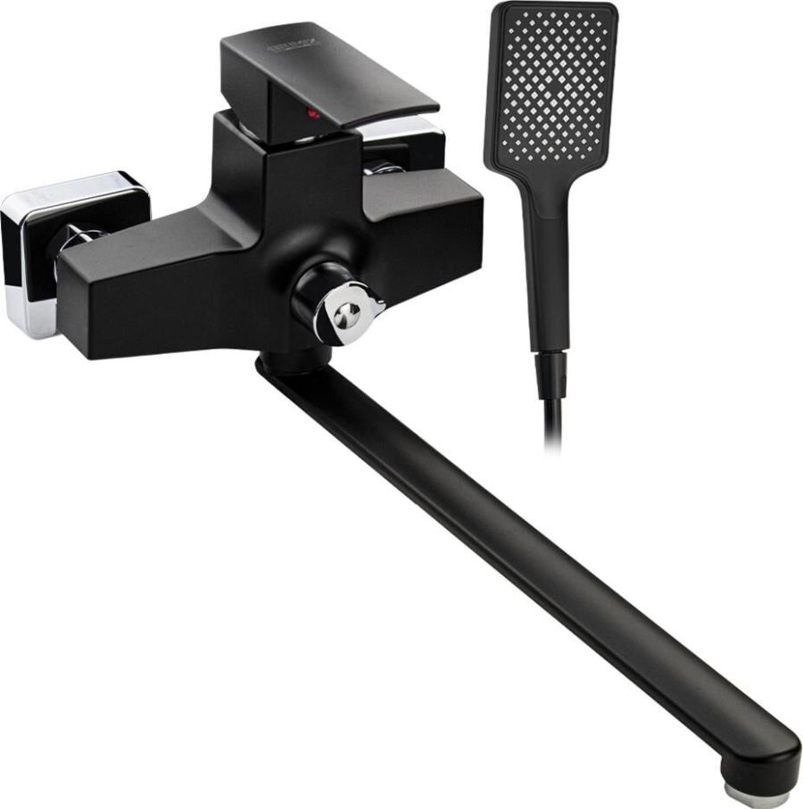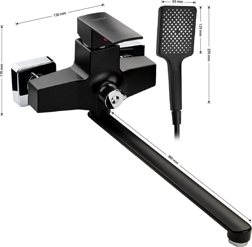 Смеситель из высокопрочного пластика АБС, ЧЕРНЫЙ в ванную / душевую комнату с длинным, плоским изливом, литой квадратный корпус, шаровый с дивертором м/к на корпусе. Картридж d = 40 мм, литая ручка, хромированный, аэратор для экономии воды, хромированные чашки и эксцентрики. Габаритные размеры: ширина 150 мм, высота корпуса 170 мм, длина излива 380 мм, душевая лейка 120*95 мм, шланг 150 см. Вес - 1.48 кг, объём - 0.00767 м3. В комплекте паспорт, корпус с изливом, дивертор, душевая лейка, шланг, кронштейн, комплект крепежа и прокладок.
