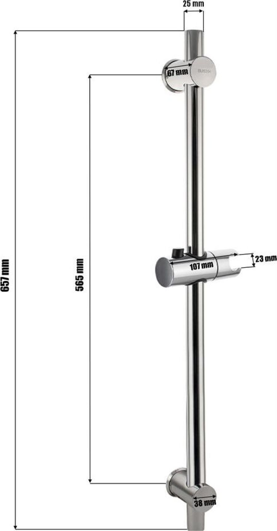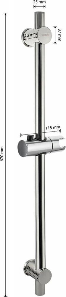 Душевая стойка, глянцевая, хром, произведена из нержавеющей стали марки 304, устойчивой к агрессивному воздействию внешней среды и механическим деформациям, держатель для душа с кнопочной фиксацией и регулировкой по высоте. Расстояние между настенными креплениями регулируется, что позволяет использовать в процессе монтажа отверстия, имеющиеся в стене. Размеры: высота штанги 670 мм, глубина 70 мм, диаметр трубы 25 мм, диаметр крепления 37 мм. Вес - 0,700 кг, объём - 0,00510 м3. В комплекте душевая штанга, крепления, держатель душевой лейки.