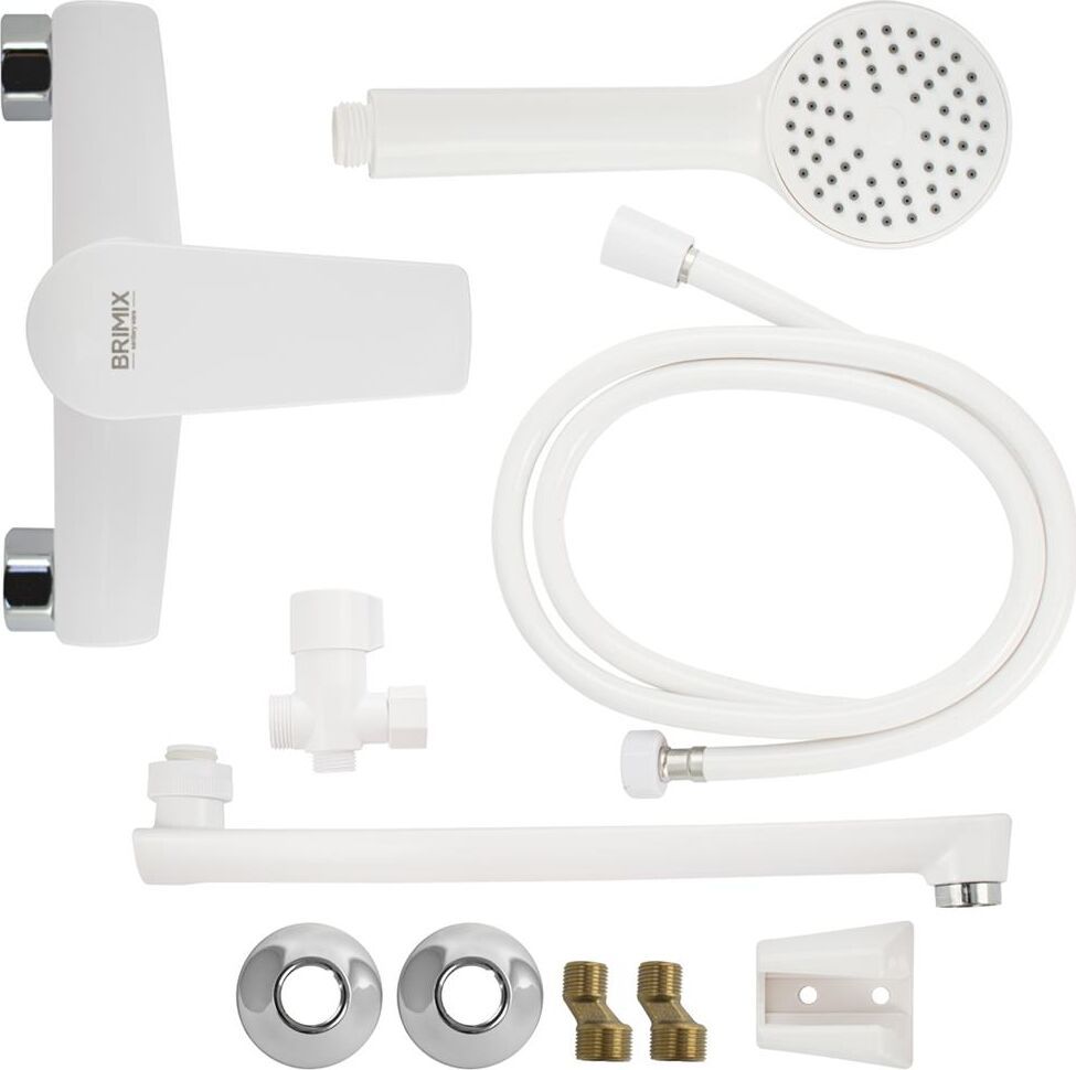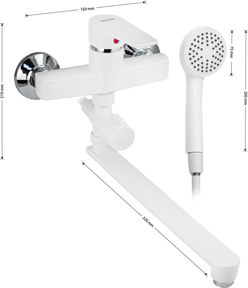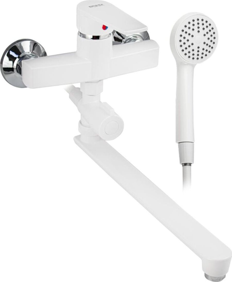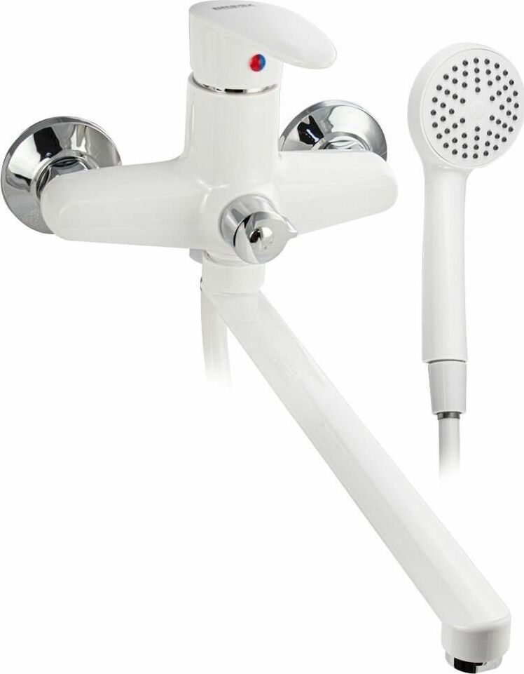 Смеситель из высокопрочного пластика АБС, БЕЛЫЙ в ванную / душевую комнату с длинным, плоским изливом, литой корпус, шаровый с дивертором м/к . Картридж d = 40 мм, литая ручка, хромированный, аэратор для экономии воды, хромированные чашки и эксцентрики. Габаритные размеры: ширина 150 мм, высота корпуса 210 мм, длина излива 320 мм, душевая лейка d = 80 мм, шланг 150 см. Вес - 1,300 кг, объём - 0 00700 м3. В комплекте паспорт, корпус с изливом, дивертор, душевая лейка, шланг, кронштейн, комплект крепежа и прокладок.