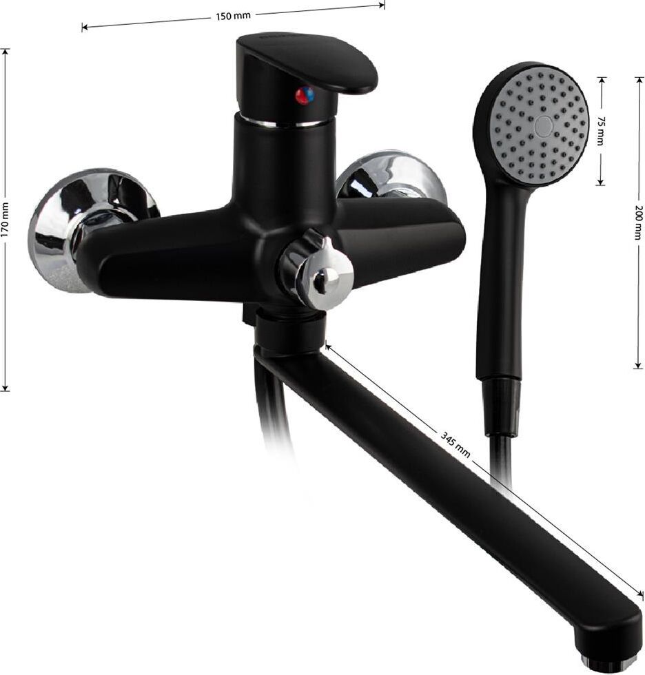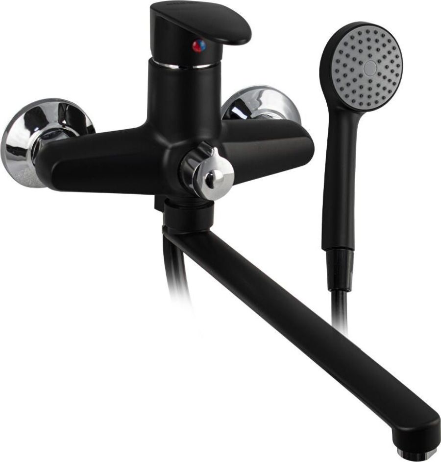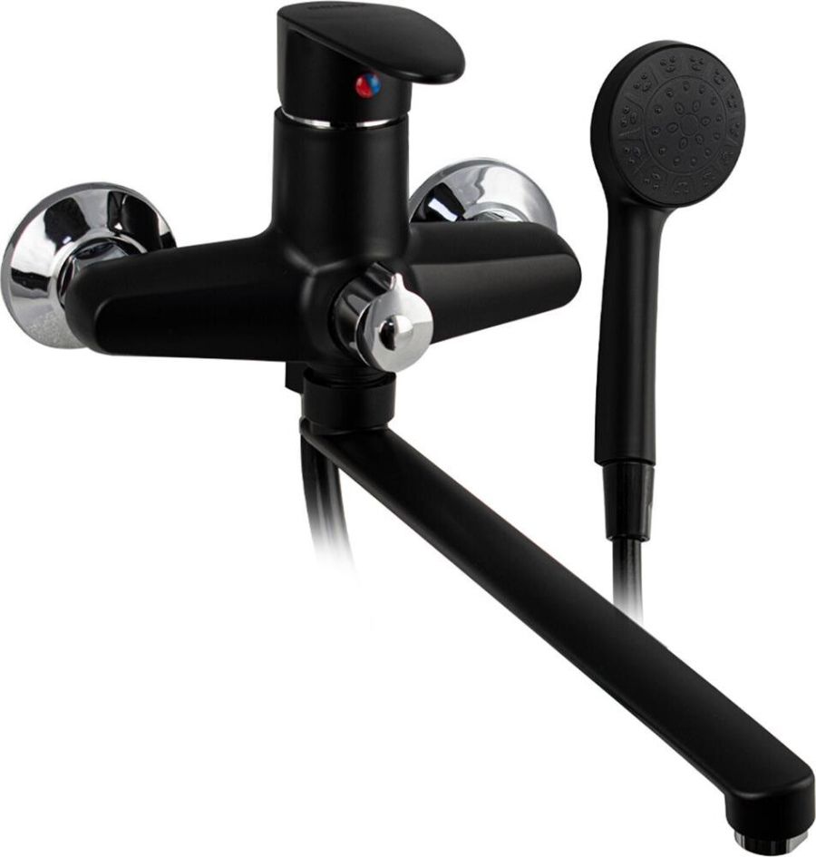 Смеситель из высокопрочного пластика АБС, чёрного цвета, в ванную / душевую комнату с длинным, плоским изливом, литой корпус, шаровый с дивертором м/к на корпусе. Картридж d = 40 мм, литая ручка, хромированный, аэратор для экономии воды, хромированные чашки и эксцентрики. Габаритные размеры: ширина 150 мм, высота корпуса 170 мм, длина излива 345 мм, душевая лейка d = 75 мм, шланг 150 см. Вес - 1,20 кг, объём - 0,0052 м3. В комплекте паспорт, корпус с изливом, дивертор, душевая лейка, шланг, кронштейн, комплект крепежа и прокладок.