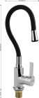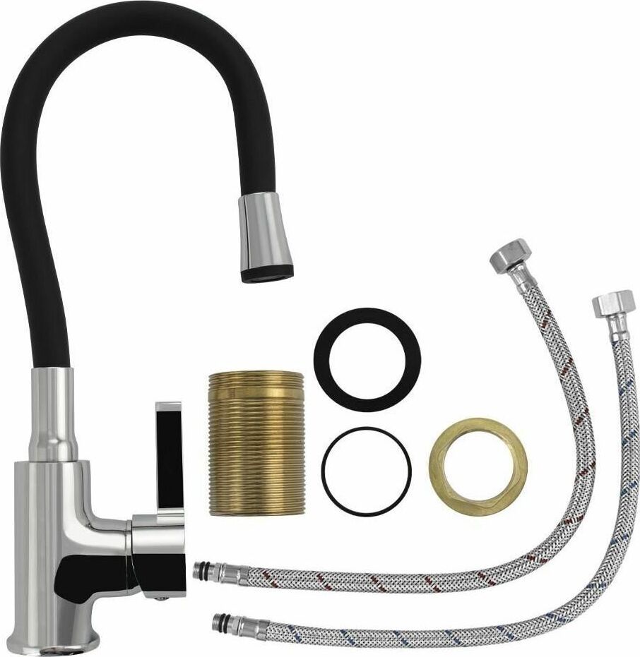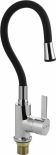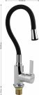 Смеситель для кухонной мойки и раковин, литой корпус хромированного цвета, с высоким гибким изливом черного цвета , с аэратором для экономии воды, шаровый. Материал изготовления — ЦАМ (цинк-алюминий-медь) + нержавеющая сталь. Крепление резьба - гайка, картридж d = 35 мм, ручка литая. Такая модель может использоваться на домашней кухне, на даче, в медицинских учреждениях и общественных местах. Габаритные размеры: высота 300 - 400 мм, длина 250 - 350 мм, диаметр посадочного седла мм, длина резьбы мм, длина подводки 500 мм. Вес - кг, объём - 0, м3. В комплекте паспорт, корпус с изливом, подводка 1/2, крепеж, набор прокладок.
