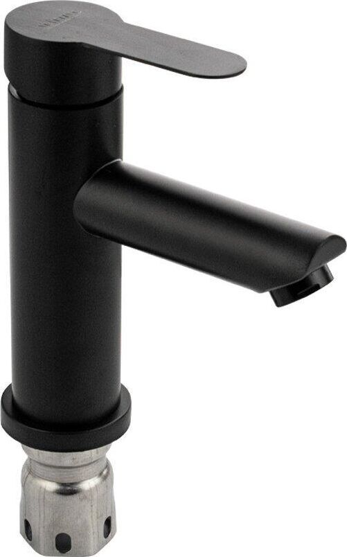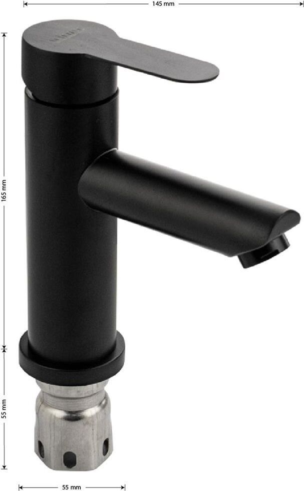 Смеситель для раковины, матовый литой корпус чёрного цвета, из нержавеющей стали марки 304, с коротким литым изливом, литая ручка, шаровый. Крепление резьба - гайка, картридж d = 35 мм. Аэратор для экономии воды. Такая модель может использоваться на домашней кухне, на даче, в медицинских учреждениях и общественных местах. Габаритные размеры: высота 165 мм, длина 145 мм, диаметр посадочного седла 55 мм, длина резьбы 55 мм, длина подводки 450 мм. Вес - 0.9 кг, объём - 0,00235 м3. В комплекте паспорт, корпус, подводка 1/2, крепеж, набор прокладок.