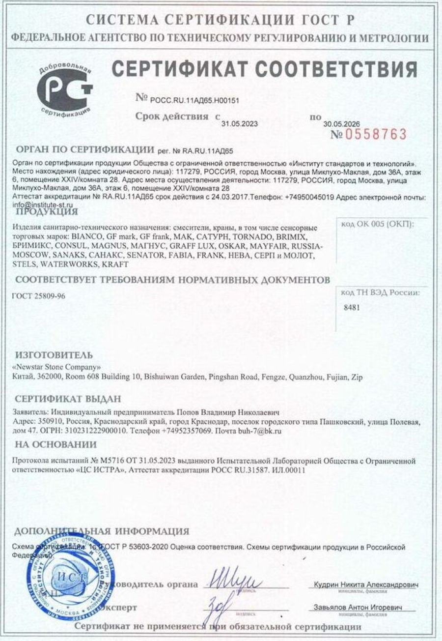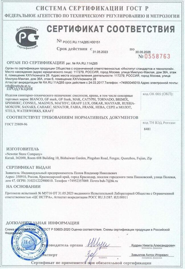 Комплектация: набор прокладок, крепеж, подводка 1/2, корпус, паспорт