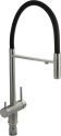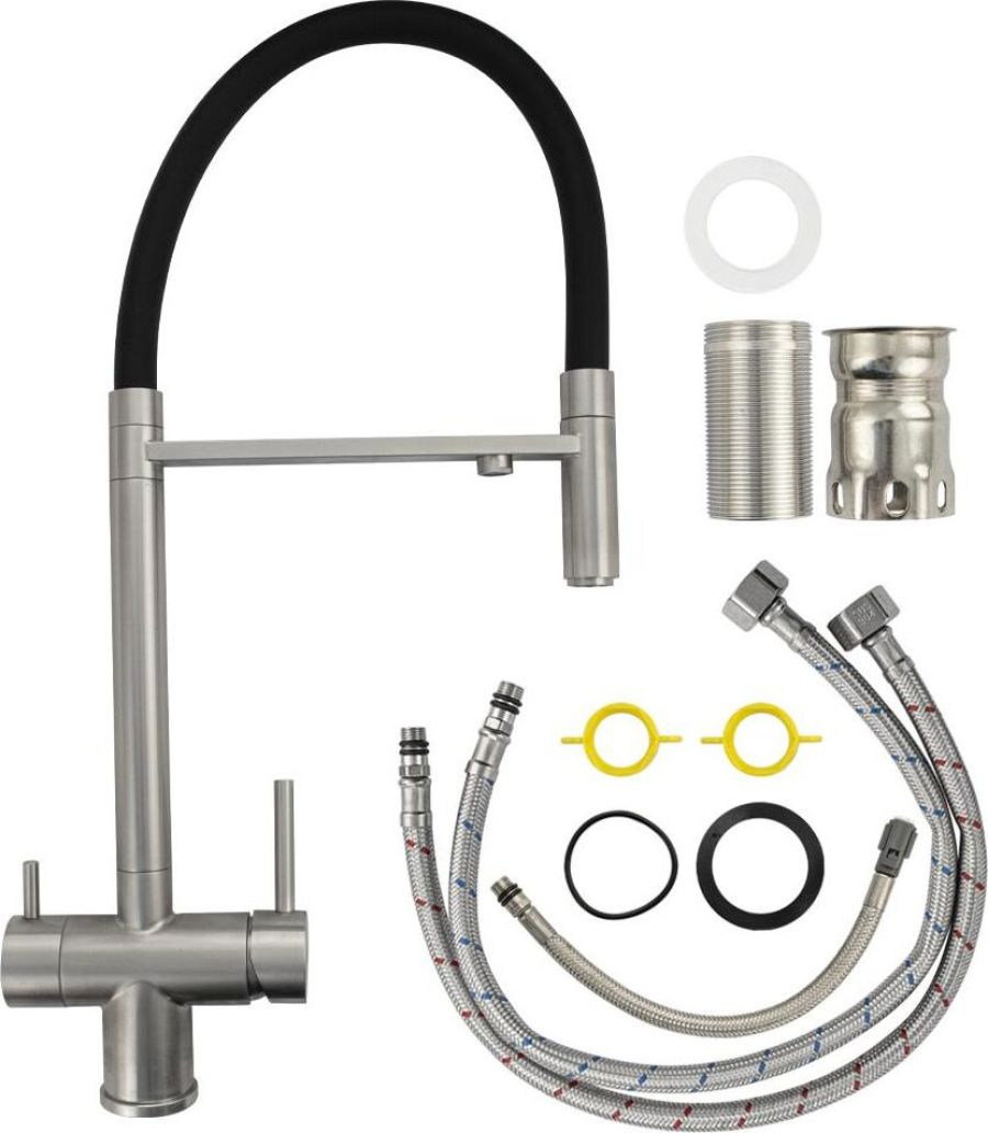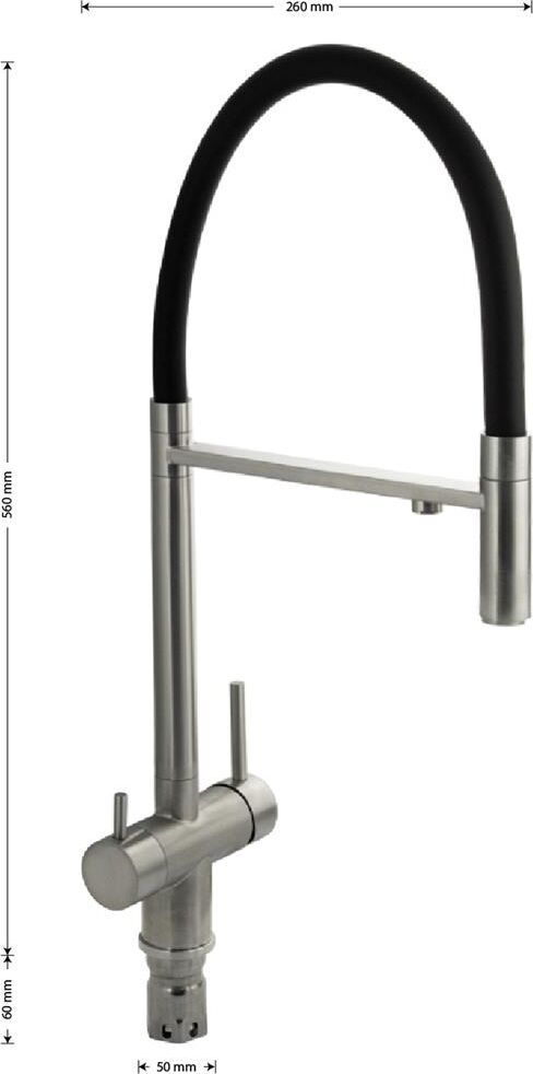 Смеситель для кухонной мойки и раковин с двойным выпуском воды для фильтра, литой матовый корпус, из нержавеющей стали марка 304, с высоким С-образным гибким изливом чёрного цвета, шаровый. Крепление резьба - гайка, картридж d = 40 мм, ручка шток. Аэратор для экономии воды. Такая модель может использоваться на домашней кухне, на даче, в медицинских учреждениях и общественных местах. Габаритные размеры: высота 560 мм, длина 260 мм, диаметр посадочного седла 50 мм, длина резьбы 60 мм, длина подводки 500 мм. Вес - 2,76 кг, объём - 0,01300 м3. В комплекте паспорт, корпус с изливом, подводка 1/2, крепеж, набор прокладок