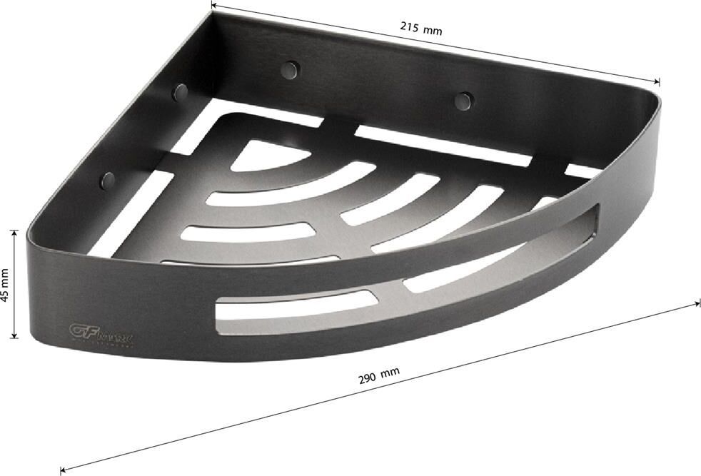 Полочка для принадлежностей треугольная, угловая, закруглённая с литым дном однаэтажная, обладает высокими эксплуатационными характеристиками и подходит для использования дома, в общественных местах: отелях, ресторанах и пр. Изготовлена из прочной нержавеющей стали с графитовым матовым покрытием, которое придает безупречный вид и долговечность. Аксессуар не занимают много места, надежно фиксируется к стене при помощи набора креплений (входят в комплект) и служит удобным местом для хранения бытовых и косметических средств. Габаритные размеры: длина стороны 215 мм, высота 45 мм, ширина 290 мм. Вес — 0,710 кг, объём — 0,00500 м3