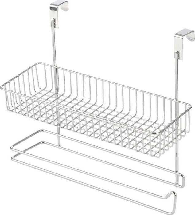 Универсальная навесная полка для кухни с держателем для бумажного полотенца (горизонтальный) Крепится на дверцу кухонного шкафчика (макс. толщина дверцы 2 см) Размер: 31,2*11*25,5 см Материал: хромированный металл