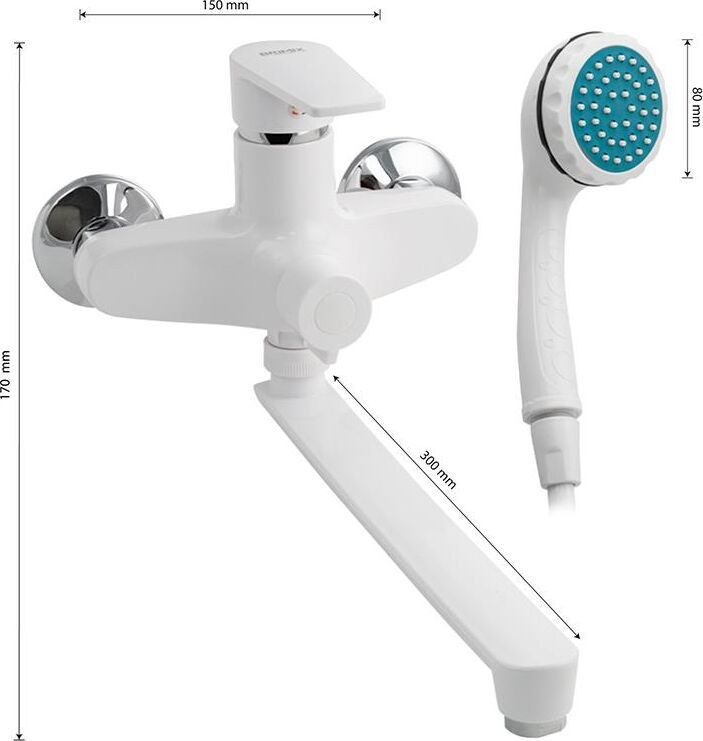 Смеситель из высокопрочного пластика АБС, БЕЛЫЙ в ванную / душевую комнату с длинным, плоским изливом, литой корпус, шаровый с дивертором м/к на корпусе. Картридж d = 40 мм, литая ручка, хромированный, аэратор для экономии воды, хромированные чашки и эксцентрики. Габаритные размеры: ширина 150 мм, высота корпуса 170 мм, длина излива 300 мм, душевая лейка d = 80 мм, шланг 150 см. Вес - 1 350 кг, объём - 0 00700 м3. В комплекте паспорт, корпус с изливом, дивертор, душевая лейка, шланг, кронштейн, комплект крепежа и прокладок.
