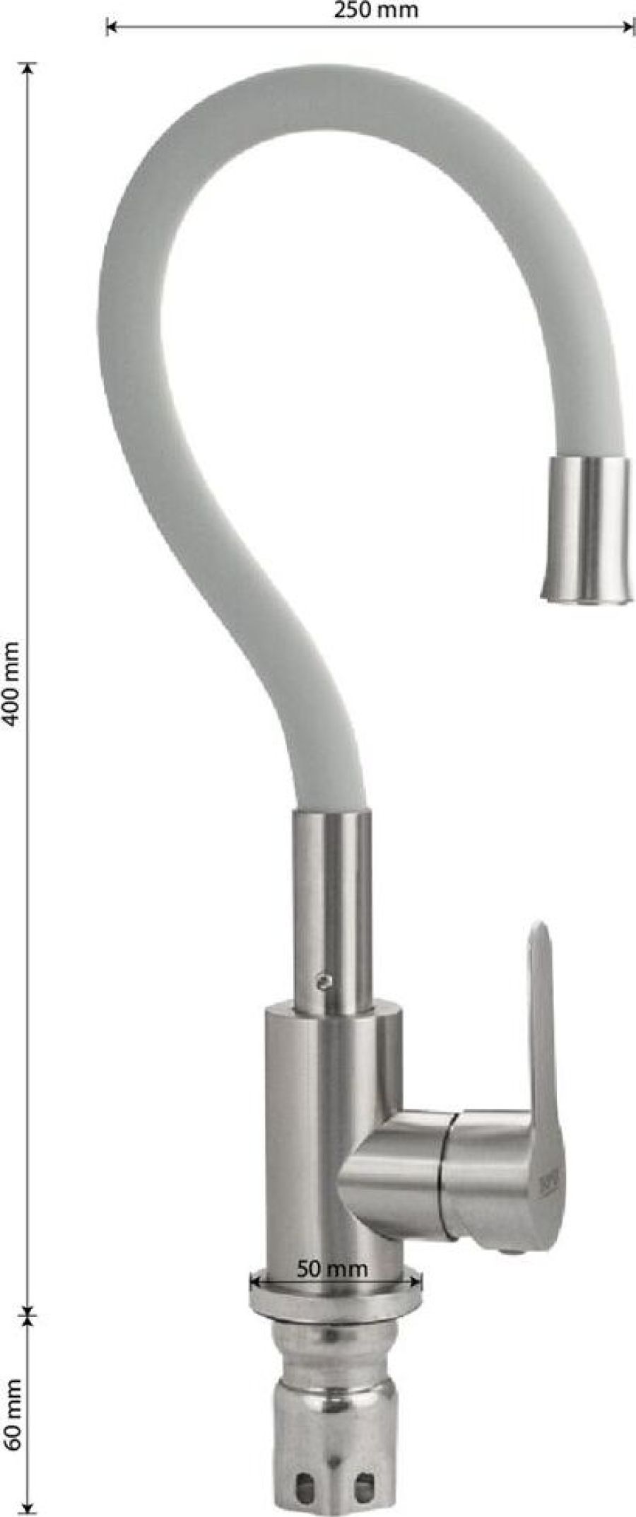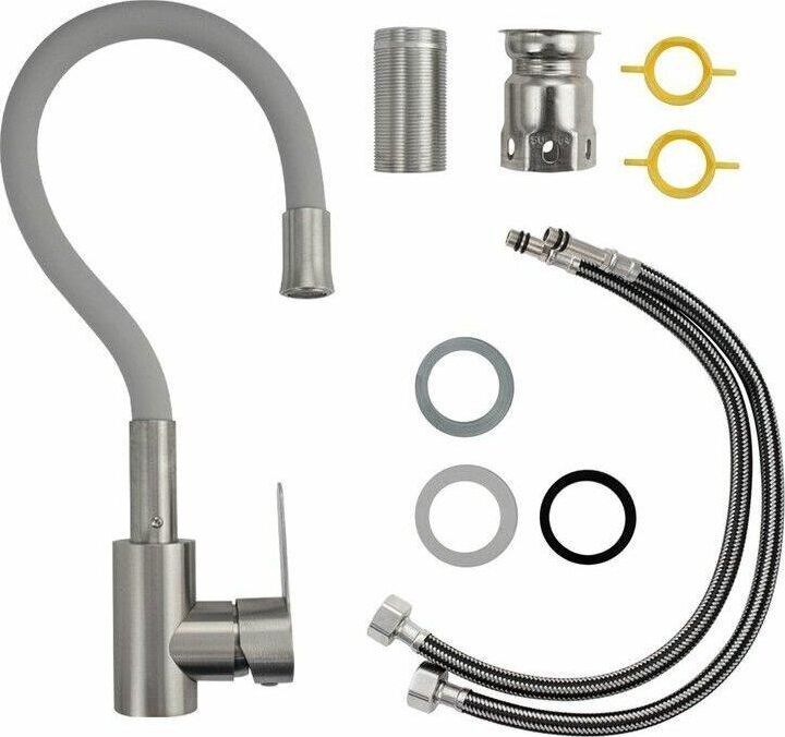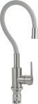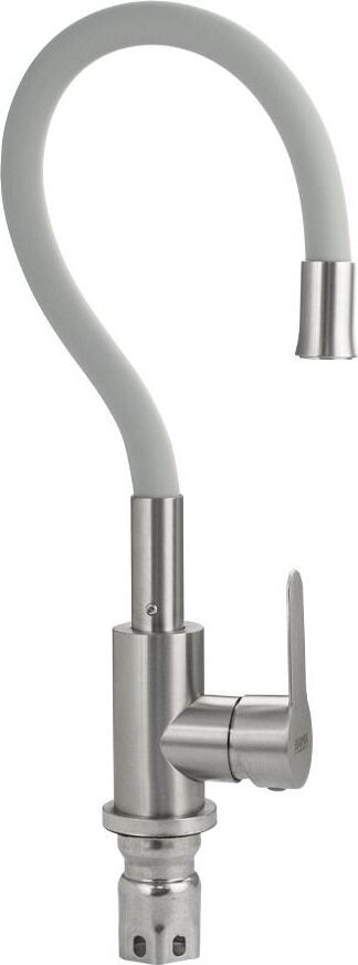 Смеситель для кухонной мойки и раковин, литой матовый корпус, из нержавеющей стали марка 304, с высоким гибким изливом серого цвета на трещётке, с аэратором для экономии воды, шаровый. Крепление резьба - гайка, картридж d = 35 мм, ручка литая, Такая модель может использоваться на домашней кухне, на даче, в медицинских учреждениях и общественных местах. Габаритные размеры: Высота 400 мм, длина 250 мм, диаметр посадочного седла 50 мм, длина резьбы 60 мм, длина подводки 450 мм, вес - кг, объём - м3. В комплекте паспорт, корпус с изливом, подводка 1/2, крепеж, набор прокладок.