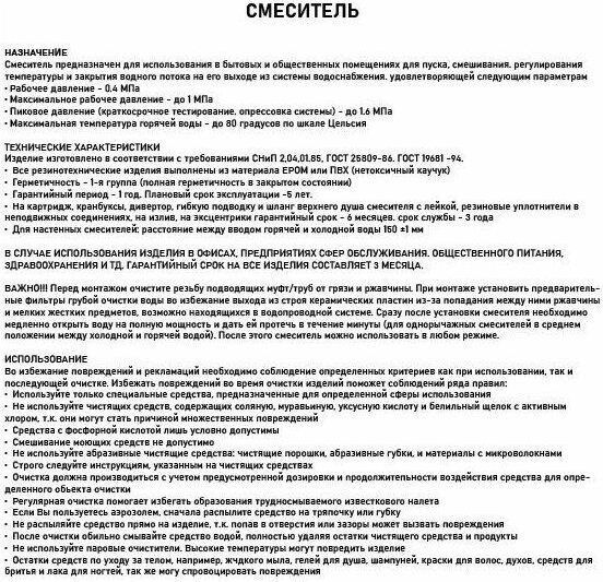 Комплектация: паспорт, корпус с изливом, подводка 1/2, крепеж, набор прокладок
