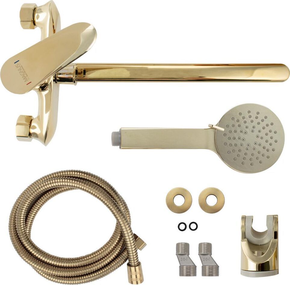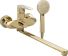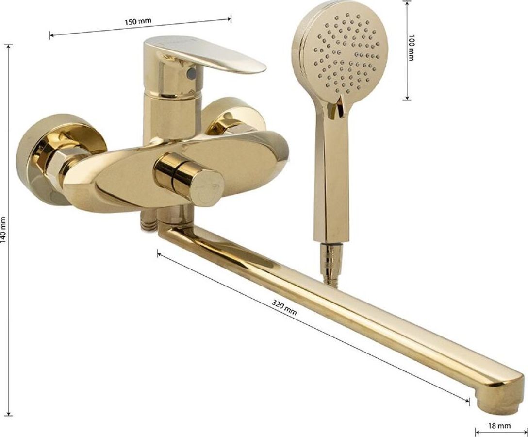 Смеситель в ванную / душевую комнату, латунный корпус под цвет ЗОЛОТА, с длинным плоским изливом, шаровый, с дивертором м/к на корпусе. Картридж d = 35 мм, литая ручка, аэратор для экономии воды, чашки и эксцентрики. Габаритные размеры: ширина 150 мм, высота корпуса 140 мм, длина излива 320 мм, круглая двухрежимная душевая лейка d = 100 мм, шланг 150 см. Вес - 2,300 кг, объём - 0,00864 м3. В комплекте паспорт, корпус с изливом, дивертор, душевая лейка, шланг, кронштейн, комплект крепежа и прокладок.