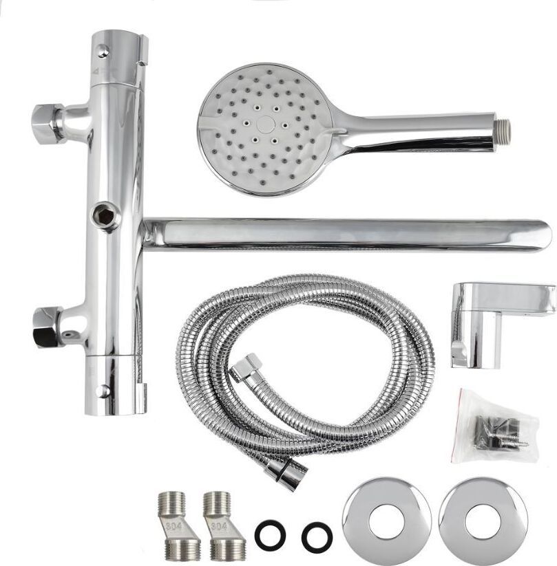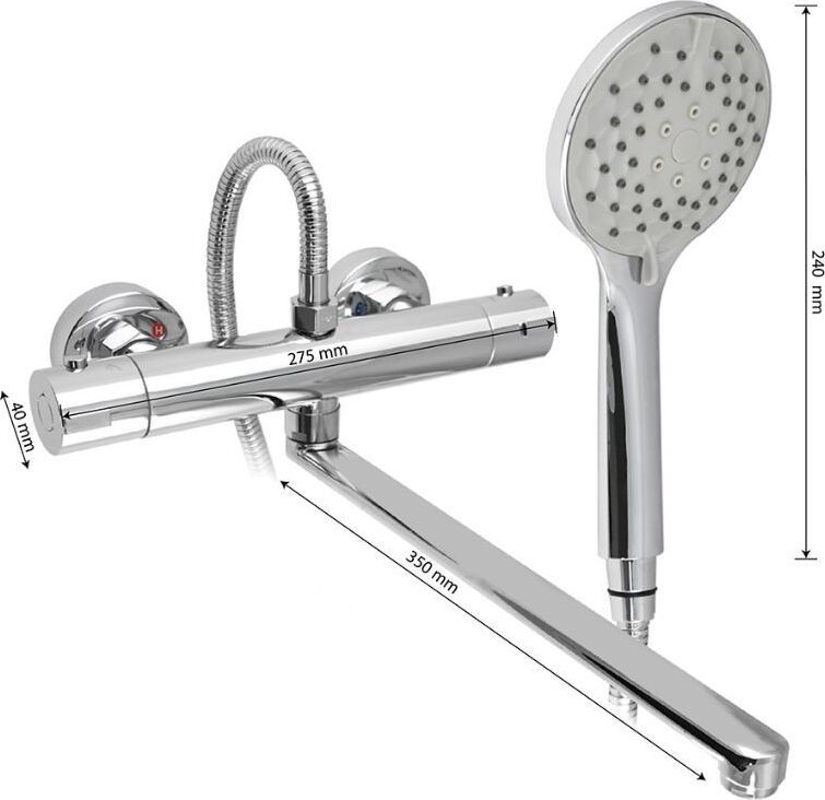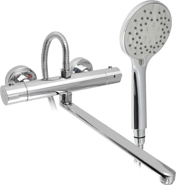 Смеситель с термостатом – надежное сантехническое оборудование. Латунный, хромированный корпус с плоским длинным изливом. Температура и напор воды устанавливаются поворотом двух удобных рукояток. Термостат поддерживает заданную температуру воды и может работать в системах низкого давления с газовыми проточными водонагревателями. Ограничитель температуры до 38 градусов спасает от возможного ожога при случайном повороте рукоятки. Встроенный аэратор формирует комфортный и приятный поток воды. Сеточка легко снимается для удаления налета. Аксессуар оснащен термостатическим картриджем с шумоподавлением и керамической кран-буксой, хромированной лейкой 2 режима и шланг хромированный. Габаритные размеры: лейка для душа 240 мм двухрежимная, корпус 275х40 мм, длина излива 350 мм, шланг 150 см. Вес - 2,400 кг, объём - 0,00864 м3. В комплекте корпус, излив, лейка, шланг, паспорт и комплект прокладок.