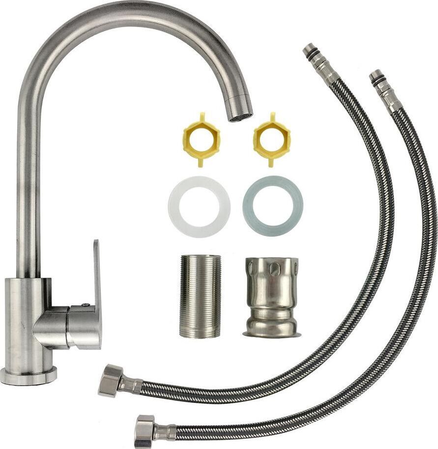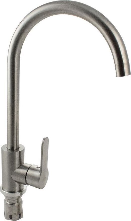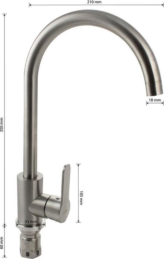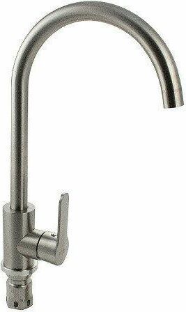Смеситель для кухонной мойки и раковин, литой матовый корпус, из нержавеющей стали марки 304, с высоким С-образным изливом, шаровый. Крепление резьба - гайка, картридж d = 35 мм, ручка литая. Аэратор для экономии воды. Такая модель может использоваться на домашней кухне, на даче, в медицинских учреждениях и общественных местах. Габаритные размеры: высота 350 мм, длина 210 мм, диаметр посадочного седла 53 мм, длина резьбы 60 мм, длина подводки 500 мм. Вес - 1,500 кг, объём - 0,00635 м3. В комплекте паспорт, корпус с изливом, подводка 1/2, крепеж, набор прокладок.