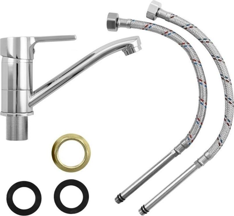 Смеситель для кухонной мойки и раковины, хромированный, с коротким, поворотным изливом, шаровый, литая ручка. Материал изготовления — ЦАМ (цинк-алюминий-медь). Крепление резьба - гайка, картридж d = 40 мм, литая ручка. Аэратор для экономии воды. Габаритные размеры: высота 100 мм, длина 170 мм, длина излива150 мм, диаметр посадочного седла 50 мм, длина резьбы 30 мм, длина подводки 400 мм. Вес - 1,000 кг, объём - 0,00231 м3. В комплекте паспорт, корпус, подводка 1/2, крепеж, набор прокладок.