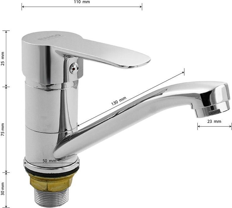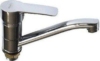 Смеситель для кухонной мойки и раковины, хромированный, с коротким, поворотным изливом, шаровый, литая ручка. Материал изготовления — ЦАМ (цинк-алюминий-медь). Крепление резьба - гайка, картридж d = 35 мм. Аэратор для экономии воды. Габаритные размеры: высота 100 мм, длина 170 мм, длина излива150 мм, диаметр посадочного седла 50 мм, длина резьбы 30 мм, длина подводки 400 мм. Вес - 0,900 кг, объём - 0,00244 м3. В комплекте паспорт, корпус, подводка 1/2, крепеж, набор прокладок.