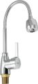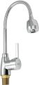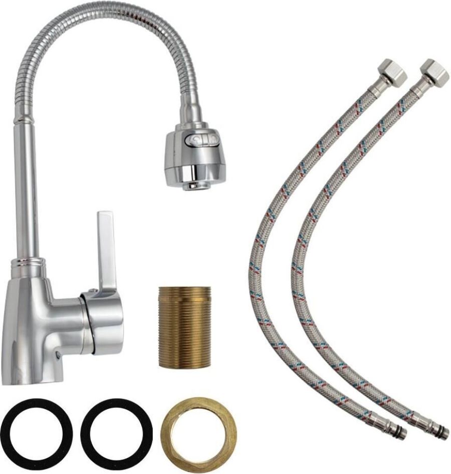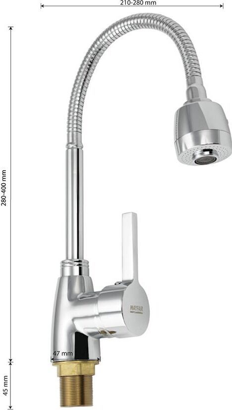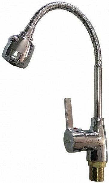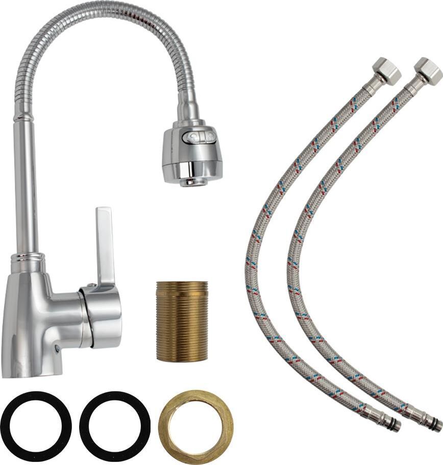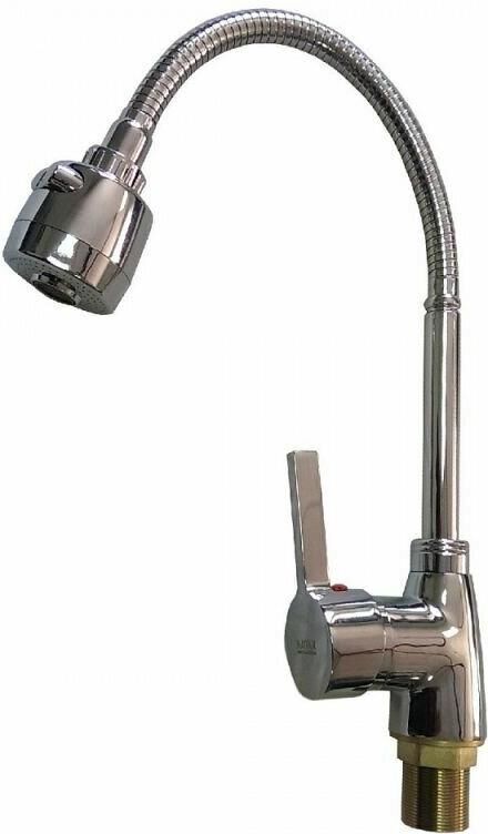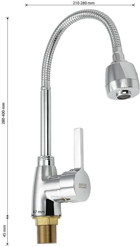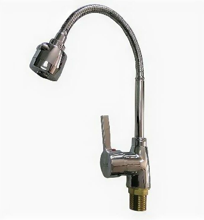 Смеситель для кухонной мойки и раковин, литой хромированный корпус, с высоким гибким изливом, с большим двухрежимным аэратором для экономии воды, шаровый. Материал изготовления — ЦАМ (цинк-алюминий-медь) + нержавеющая сталь. Крепление резьба - гайка, картридж d = 40 мм, ручка шток. Такая модель может использоваться на домашней кухне, на даче, в медицинских учреждениях и общественных местах. Габаритные размеры: высота 280 - 400 мм, длина 210 - 280 мм, диаметр посадочного седла 47 мм, длина резьбы 45 мм, длина подводки 350 мм. Вес - 1,050 кг, объём - 0,00317 м3. В комплекте паспорт, корпус с изливом, подводка 1/2, крепеж, набор прокладок.