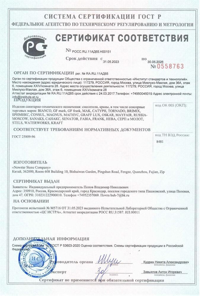 Комплектация: набор прокладок, крепеж, подводка 1/2, корпус с изливом, паспорт