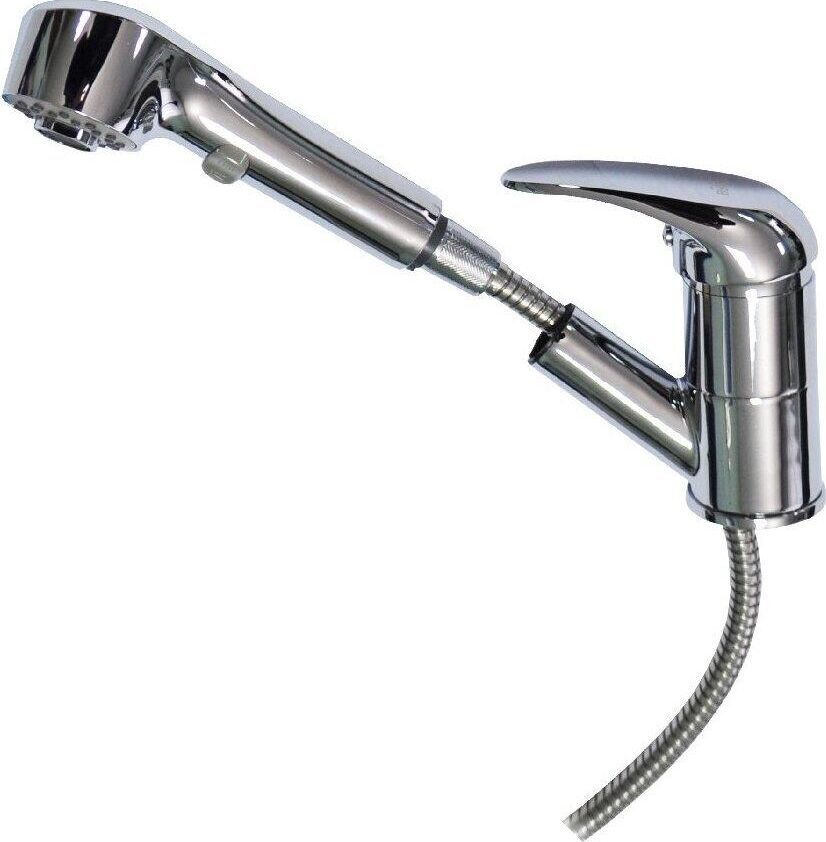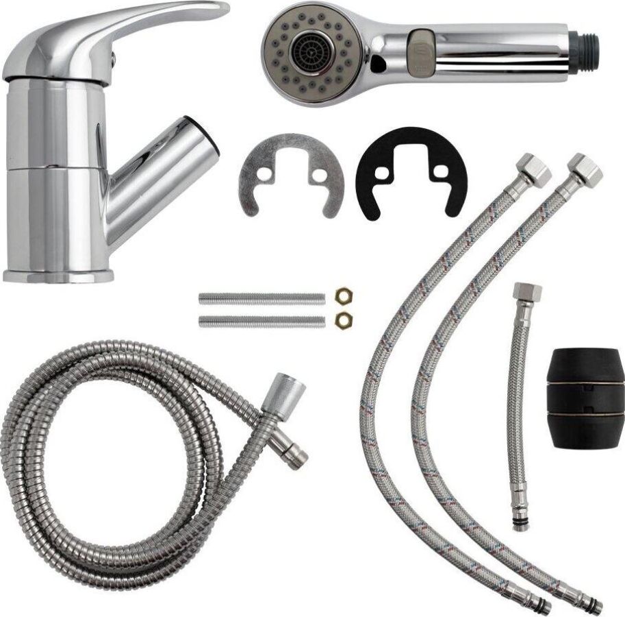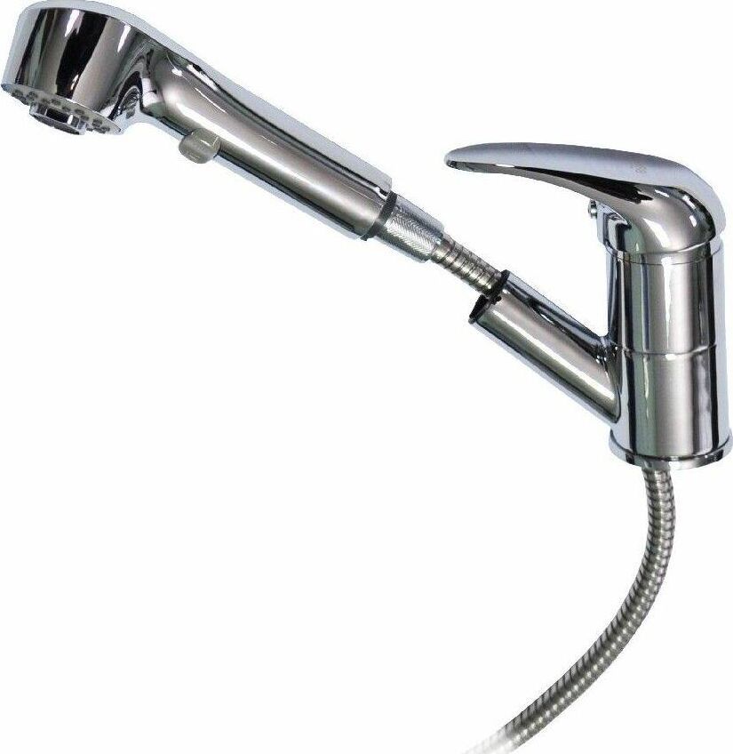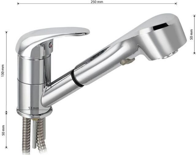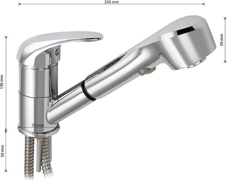 Смеситель для кухонной мойки и раковин, вытяжной излив, лейка с переключением режимов подачи воды, литой хромированный корпус, шаровый. Материал изготовления — ЦАМ (цинк-алюминий-медь) + нержавеющая сталь. Крепление на шпильке, картридж d = 40 мм, ручка литая. Аэратор для экономии воды. Такая модель может использоваться на домашней кухне, на даче, в медицинских учреждениях и общественных местах. Габаритные размеры: высота 130 мм, длина 250 + вытяжной шлаг 100 см, диаметр посадочного седла 53 мм, длина подводки 400 мм, длина шланга - 100 см. Вес - 1,650 кг, объём - 0,00346 м3. В комплекте паспорт, корпус с изливом, подводка 1/2, крепеж, набор прокладок.