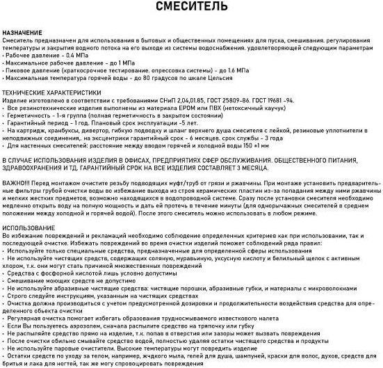 Комплектация: паспорт, корпус с изливом, подводка 1/2, крепеж, набор прокладок.