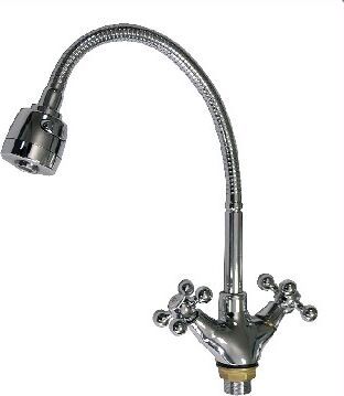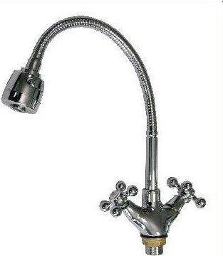 Смеситель для кухонной мойки и раковин, массивный корпус с гибким изливом, хромированный, с двухрежимным аэратором для экономии воды. Материал изготовления — ЦАМ (цинк-алюминий-медь) + нержавеющая сталь. Крепление резьба - гайка. Кранбукса м/к 1/2, ручка крест, поворот на 90˚. Габаритные размеры: высота 250 - 310 мм, длина 200 - 250 мм, диаметр посадочного седла 40 мм, длина резьбы 30 мм, длина подводки 350 мм. Вес - 1,400 кг, объём - 0,00500 м3. В комплекте корпус с изливом, паспорт, подводка 1/2, крепёж .
