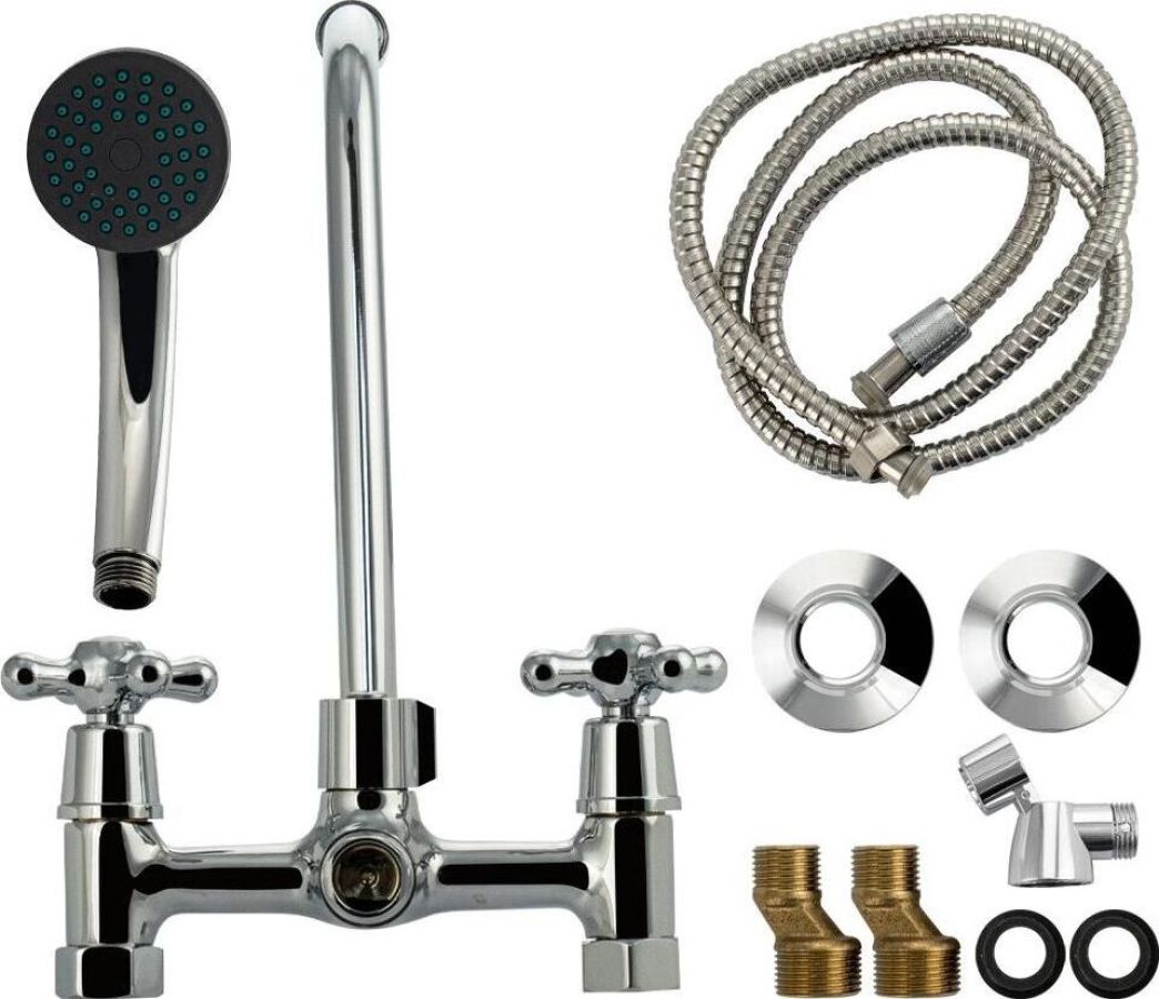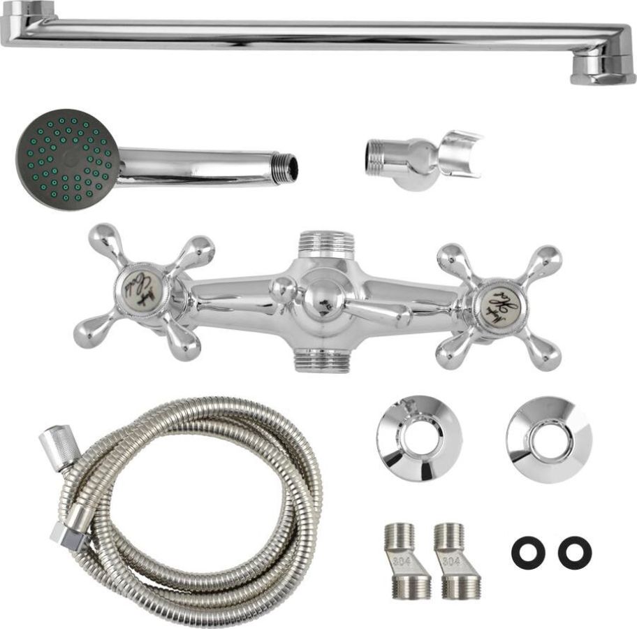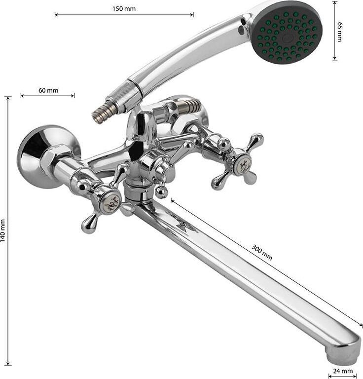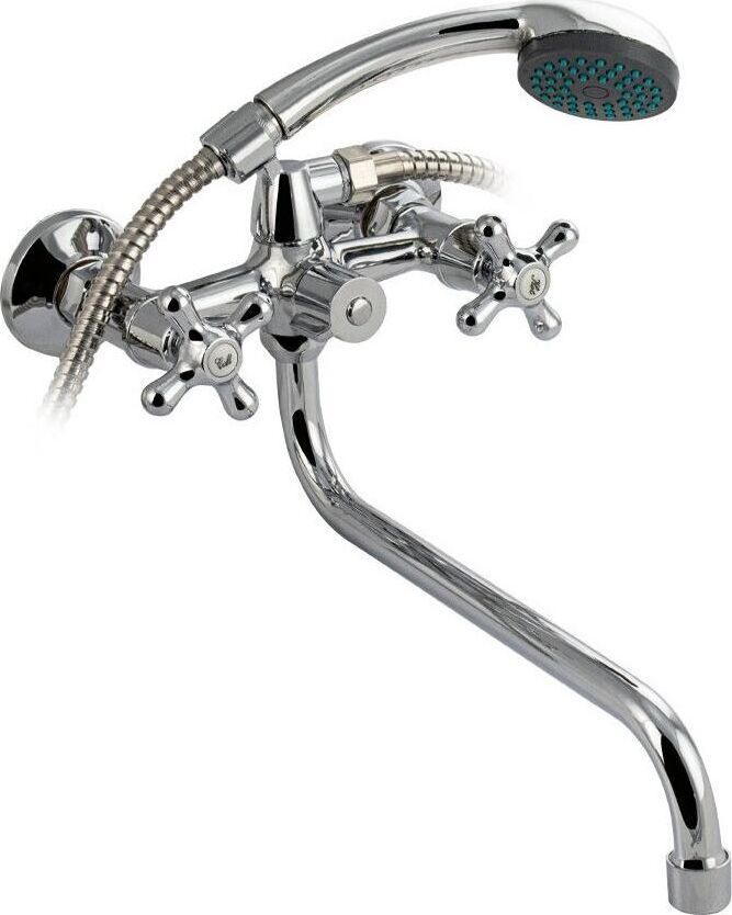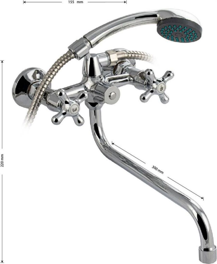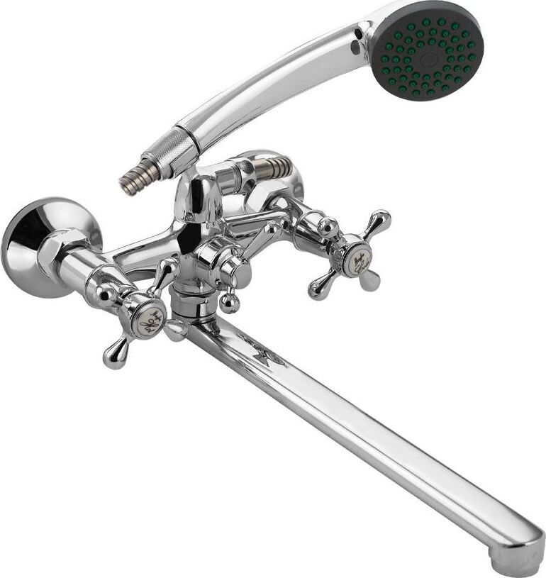 Смеситель хромированный, в ванную / душевую комнату с длинным плоским изливом. Материал изготовления — ЦАМ (цинк-алюминий-медь) + нержавеющая сталь. Кранбуксы металлокерамика 1/2, ручки крест, поворот на 90˚. Дутый, большой корпус с шаровым переключением подачи воды, аэратор для экономии воды, подставка - "рога" для лейки, чашки, гайки и эксцентрики из нержавеющей стали. Габаритные размеры: ширина 150 мм, высота 140 мм, длина излива 300 мм, диаметр чашки 60 мм, длина шланга 150 см, лейка d = 65 мм. Вес - 1,400 кг, объём - 0,00529 м3. В комплекте корпус с изливом, паспорт, крепёж, прокладки, лейка, шланг.