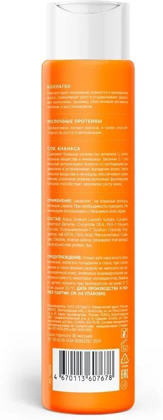 Коллаген Препятствует появлению ломкости и выпадению волос, стимулирует рост и поддерживает здоровье волосяных луковиц, обеспечивает активное питание и восстановление. Молочные протеины Эффективно питают волосы, активизируют их рост и регенерацию. Сок ананаса Содержит большое количество витамина C, питательные вещества и минералы. Витамин С - это мощный антиоксидант, который борется со свободными радикалами и препятствует выпадению волос; питательные вещества и минералы обеспечивают укрепление и усиленное питание волосяных луковиц для здорового роста волос. Состав: Aqua, Sodium Laureth Sulfate, Cocamidopropyl Betaine, Cocamide DEA, PEG-7 Glyceril Cocoat, Polyquaternium-7, Sodium Chloride, Fragrance, salt EDTA, Citric Acid, Phenoxyethanol, Collagen, Elastine, Ananas sativus (pineapple) fruit extract, Hydrolyzed milk protein, dye Способ применения: Нанесите на влажные волосы, вспеньте, смойте. При необходимости повторить. Рекомендуем использовать с бальзамом этой серии. рН: 6 Срок годности: 36 мес.