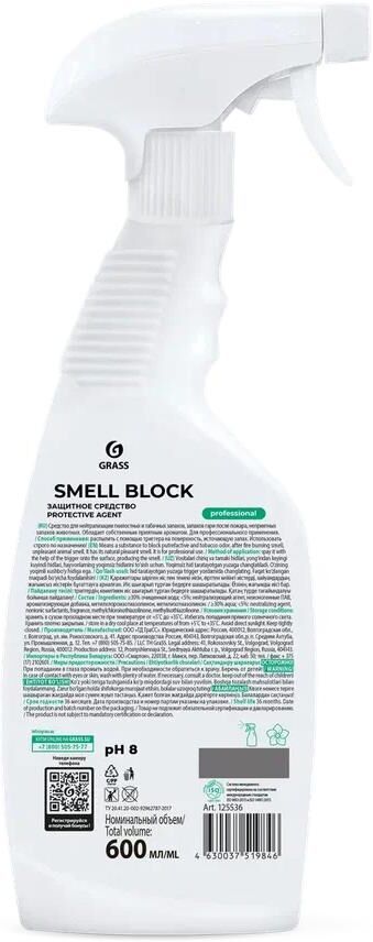 Нейтрализатор запаха "Smell Block" Professional (флакон 600 мл) Средство для нейтрализации гнилостных и табачных запахов, запахов гари после пожара, неприятных запахов животных. Обладает собственным приятным ароматом. Состав: ≥30% очищенная вода; <5%: нейтрализующий агент, неионогенные ПАВ, ароматизирующая добавка, метилхлороизотиазолинон, метилизотиазолинон. Способ применения: распылить с помощью триггера на поверхность, источающую запах. Использовать строго по назначению