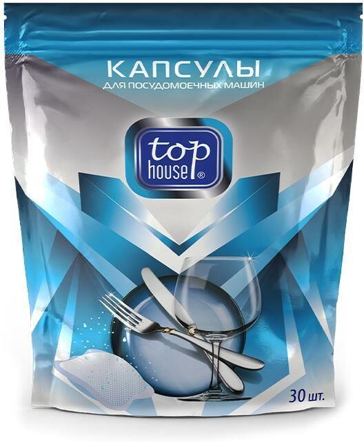 TOP HOUSE Капсулы для посудомоечных машин, 30 шт. Эффективное средство, предназначенное для удаления стойких загрязнений. Капсулы удобны и безопасны, не содержат фосфатов, триазолов и отдушек. Удаляют пригоревшие и засохшие загрязнения, жиры и крахмал. Предупреждают образование известкового налета. Капсула в водорастворимой пленке – нет контакта кожи с содержимым капсулы. Быстро растворяются и бережно очищают посуду и столовые приборы.