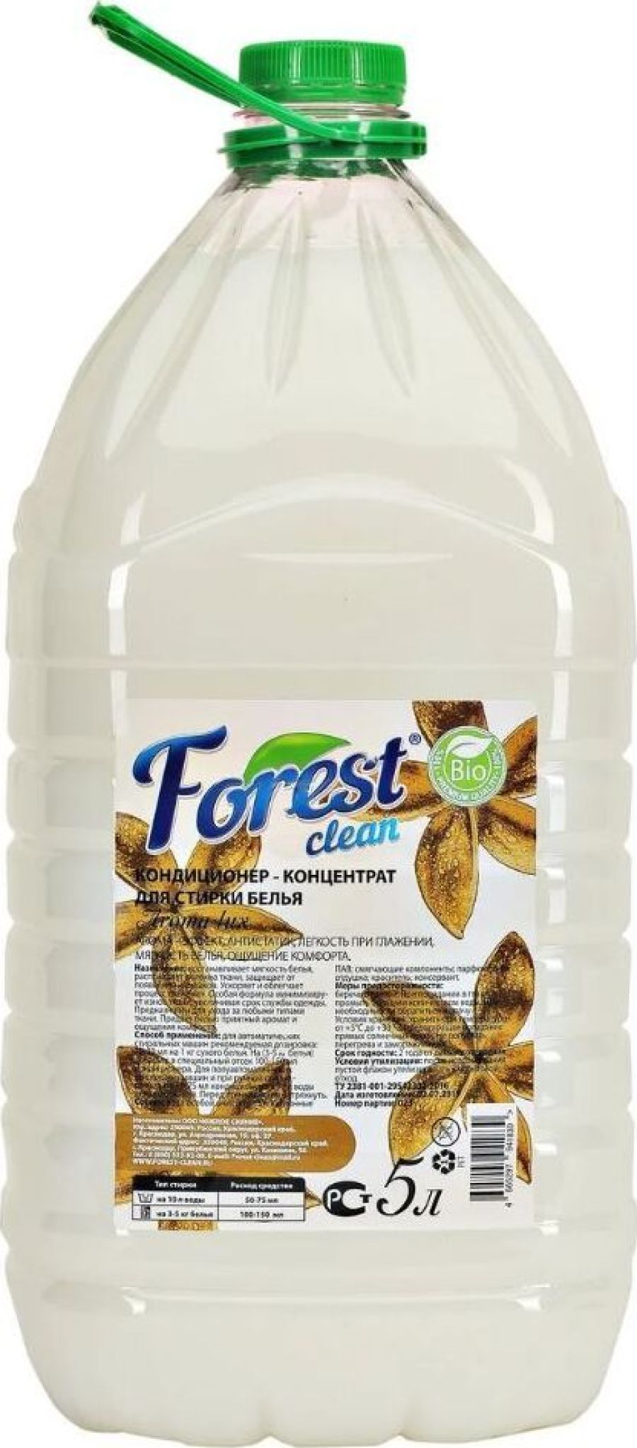 FOREST CLEAN Кондиционер для стирки белья "AROMA LUX" 5 л Восстанавливает мягкость белья, расправляет волокна ткани, защищает от появления катышков, ускоряет и облегчает процесс глажения. Особая формула минимизирует износ ткани, увеличивая срок службы одежды. Предназначен для ухода за любыми типами ткани. Придаёт белью приятный аромат и создаёт ощущение комфорта. Способ применения: для автоматических стиральных машин рекомендуемая дозировка: 20-30 мл. на 1 кг. сухого белья. На 3-5 кг. сухого белья рекомендуемая дозировка-100-150 мл. кондиционера. Для полуавтоматических стиральных машин и при ручной стирке рекомендуемая дозировка кондиционера 50-75 мл. на 10 л. воды для полоскания. Перед применением необходимо встряхнуть ёмкость с кондиционером. Для достижения идеального результата рекомендуем использовать вместе с гелем для стирки FOREST CLEAN. А для белого белья рекомендуем использовать кислородный отбеливатель FOREST CLEAN.